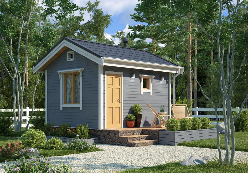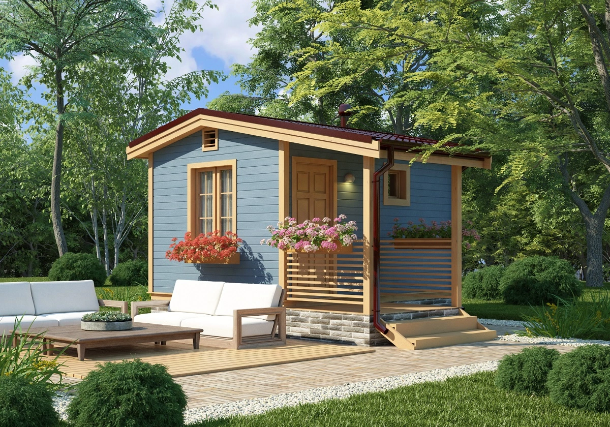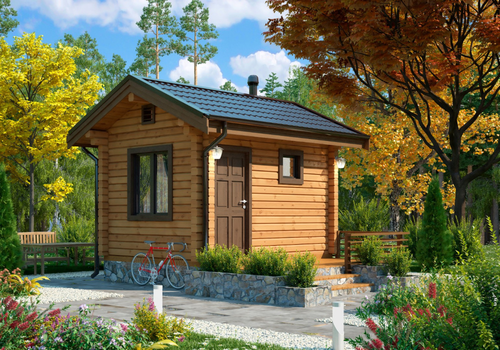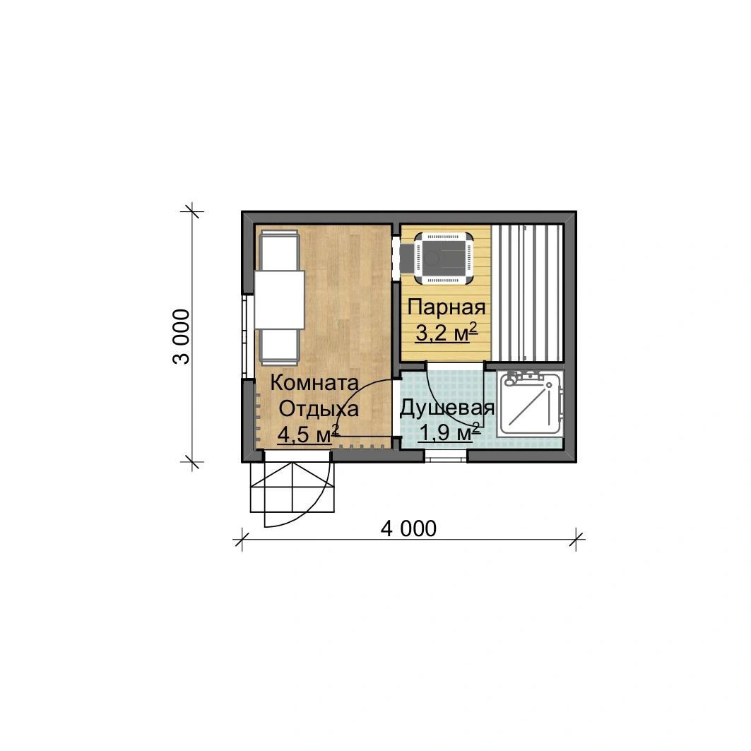 Баня-малютка с общей площадью 9,58 м2 поместится даже на самом маленьком участке. Ее планировка проста и незамысловата: душевая (1,9 м2), парная (3,2 м2) и комната отдыха (4,5 м2). Маленькая, да удаленькая! Баня хорошо держит тепло за счет своего небольшого размера.