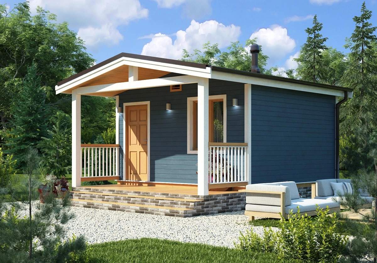 Войдя внутрь, вы попадаете в комнату отдыха размером 6,7 м2, где можно переодеться, посидеть и расслабиться. Безмятежная атмосфера и приглушенное освещение создадут идеальную обстановку для отдыха или общения с друзьями и семьей. Рядом с душевой (2,3 м2) находится небольшая парная площадью 4,3 м2. В парилке достаточно места для деревянных скамеек, где вы можете прилечь и отдохнуть. Внутри находится дровяная печь, излучающая нежное тепло и окутывающая пространство уютной атмосферой. К печи проведен дымоход. Кроме того, здесь же установлен встроенный резервуар, который подает горячую воду для приятных паровых сеансов.
