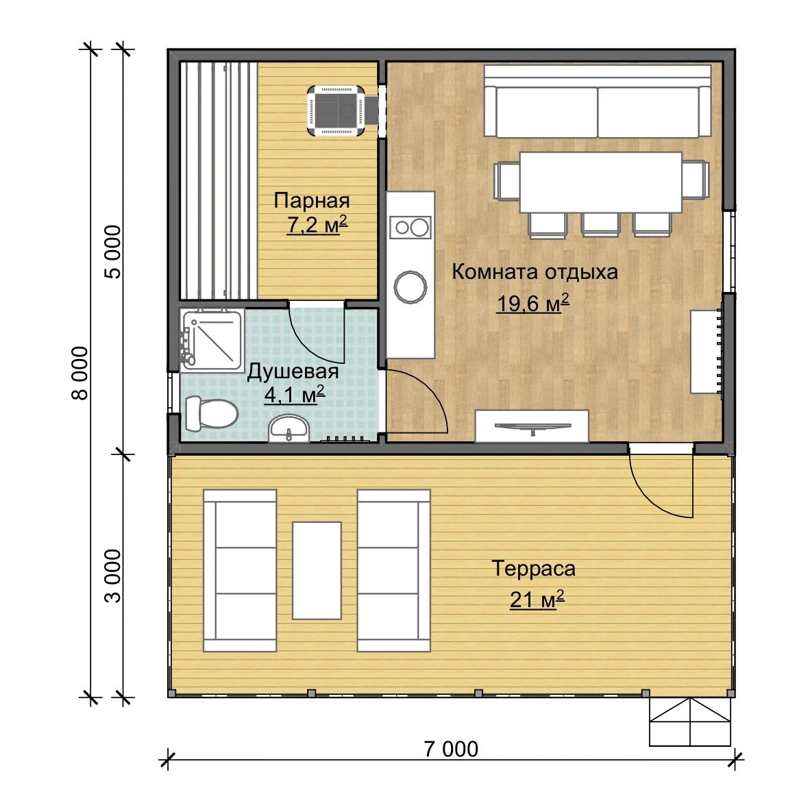 Обратите внимание на просторные комнаты: душевая (4,1 м2), комната отдыха (19,6 м2) и парная (7,2 м2). Здесь поместится много людей, что особенно актуально для большой семьи или для тех, кто любит приглашать гостей. Ну, и вишенка на торте — большая терраса площадью 21 м2! Здесь поместятся и гриль, и скамейка качели, и длинный стол. Домашние посиделки выходят на новый уровень!
