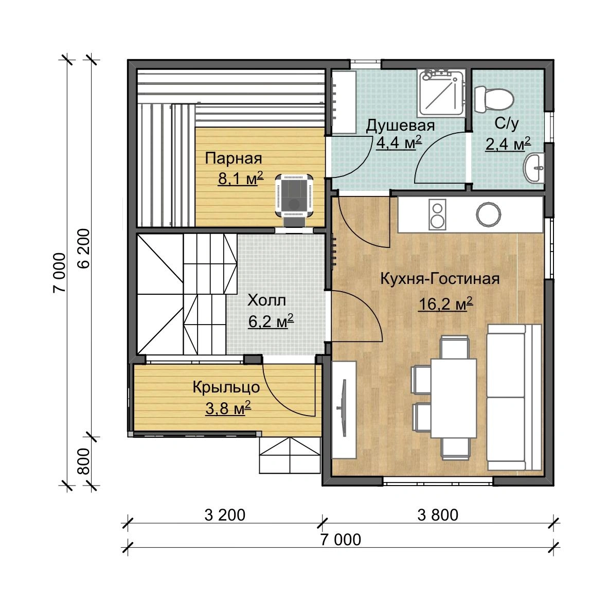 Душевая площадью 4,4 м2 может быть оборудована душевой кабиной, современной тумбой под раковину и шкафами для хранения туалетных принадлежностей и полотенец. Паровая площадью 8,1 м2 является сердцем бани. В ней установлена дровяная печь с дымоходом, создающая уютную атмосферу. Печь дополнена баком для воды. Парилка предназначена для комфортного отдыха и может включать скамейки для размещения. К основной зоне бани примыкает крыльцо площадью 3,8 м2. Оно может быть обставлено уличной мебелью, например скамейкой или креслами, создавая уютное место для наслаждения окружающей средой.