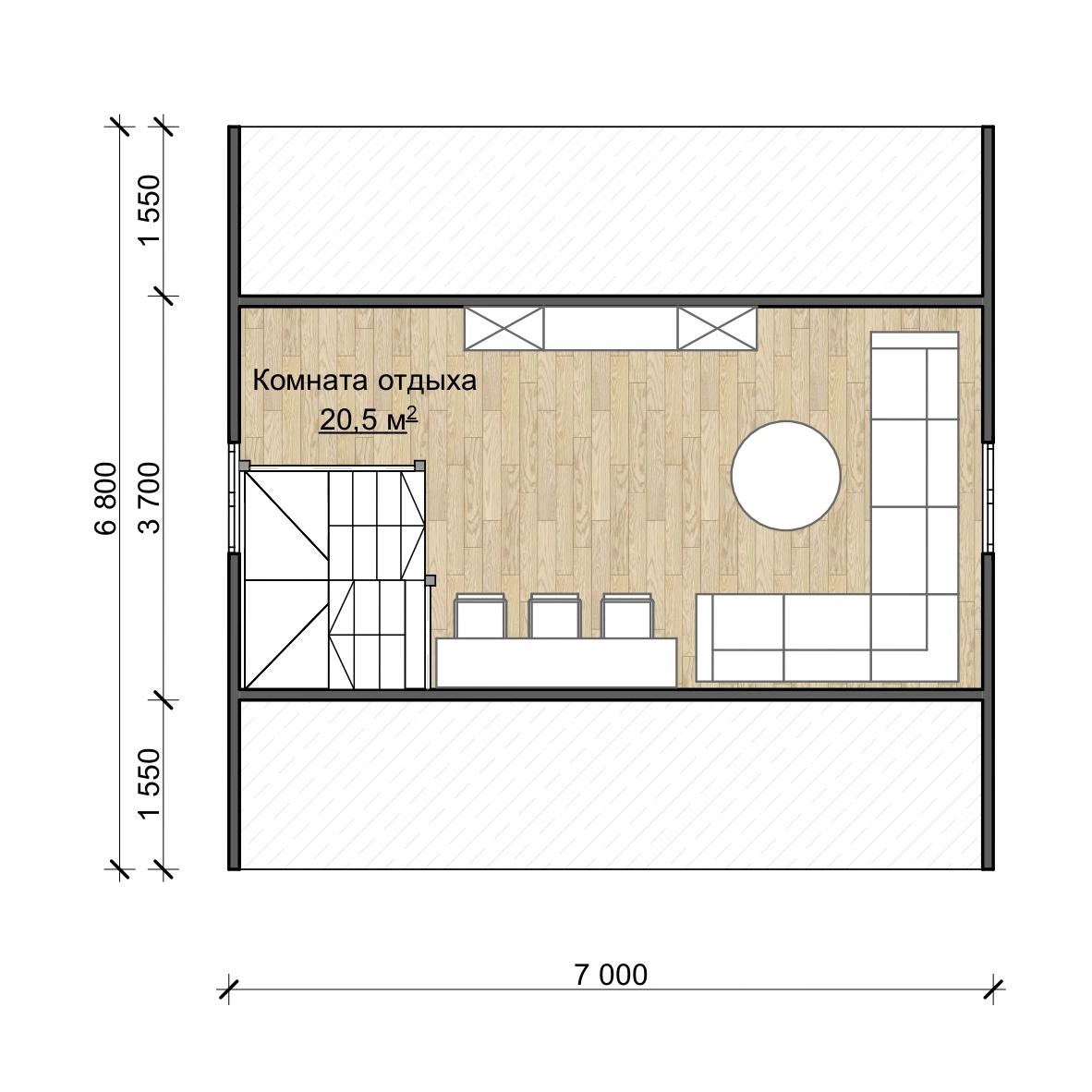 Баня представляет собой просторную обитель для релаксации общей площадью 61,6 м2. На кухне-гостиной (16,2 м2) можно принимать гостей.