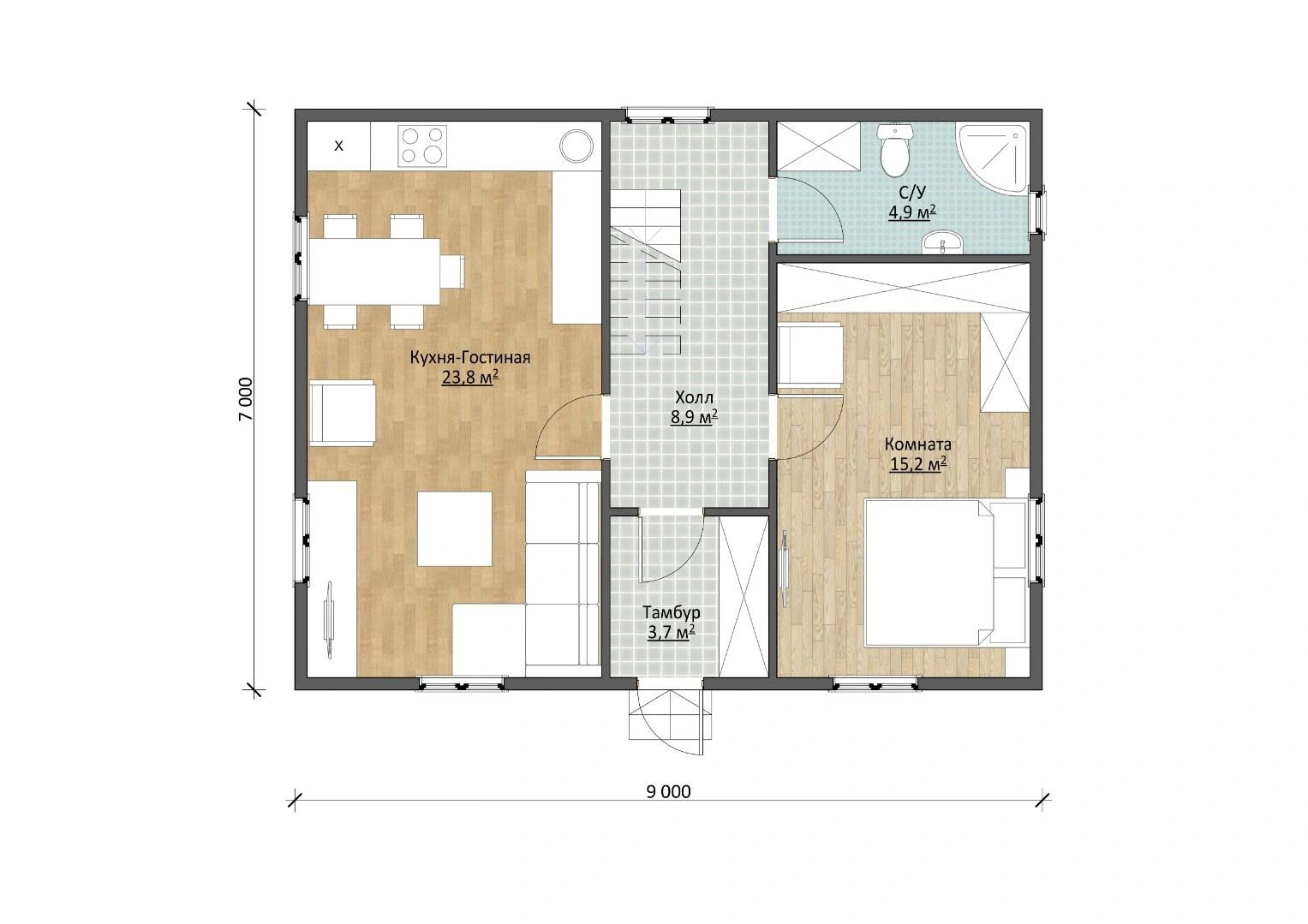На первом этаже в кухне-гостиной площадью 23,8 м² разместится вся необходимая столовая мебель и бытовая техника. В просторном 8,9-метровом холле с примыкающим тамбуром можно расставить шкафы и полки для хранения вещей. Комната в 15,2 м² станет удобным кабинетом или местом для отдыха. А в почти 5-метровый санузел войдут душевая кабина или ванна, раковина, унитаз и стиральная машина.