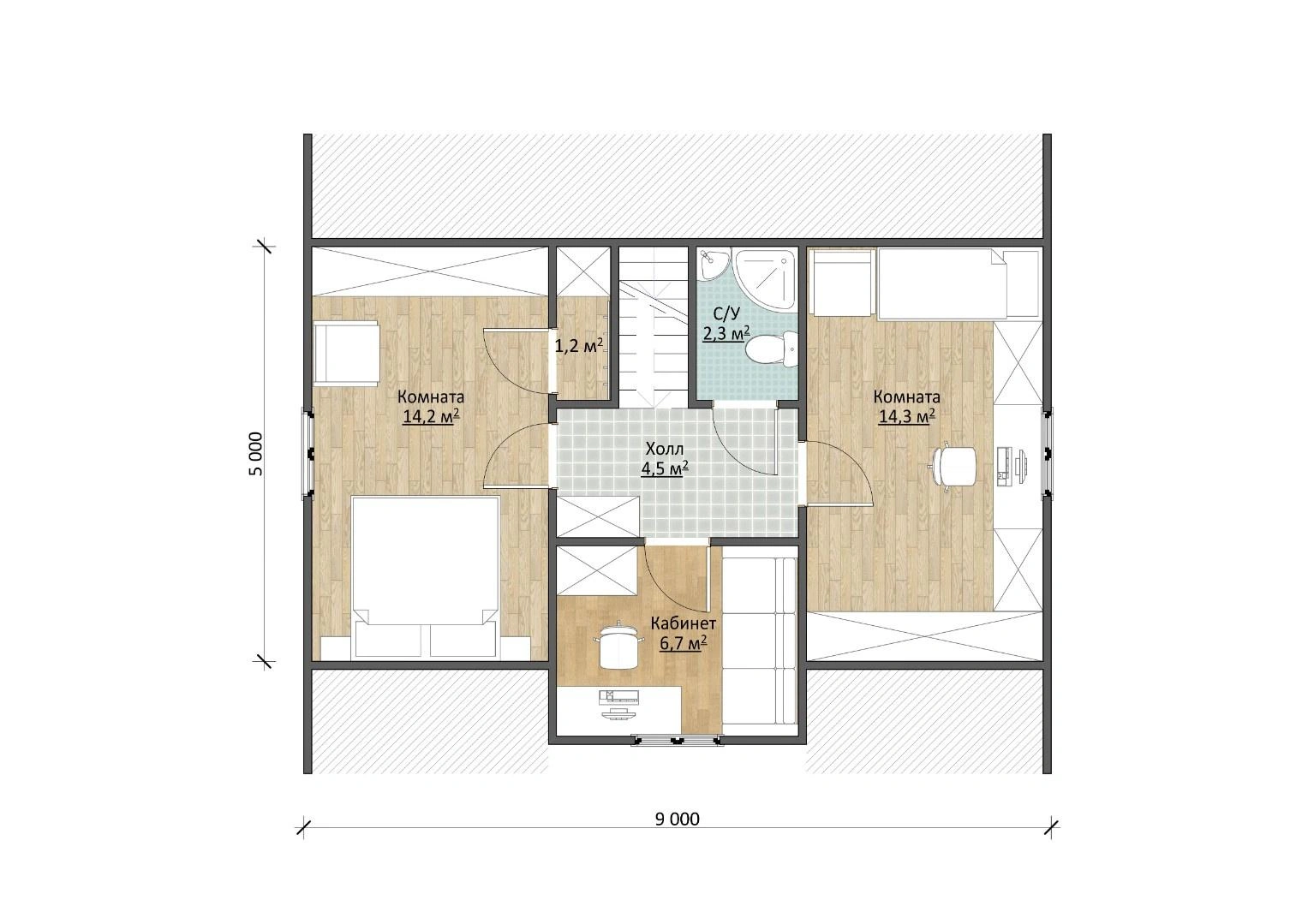 Наверху расположены: уютный 4,5-метровый холл, две просторные комнаты в 14,2 м², гардеробная, удобный кабинет и еще один санузел площадью в 2,3 м².