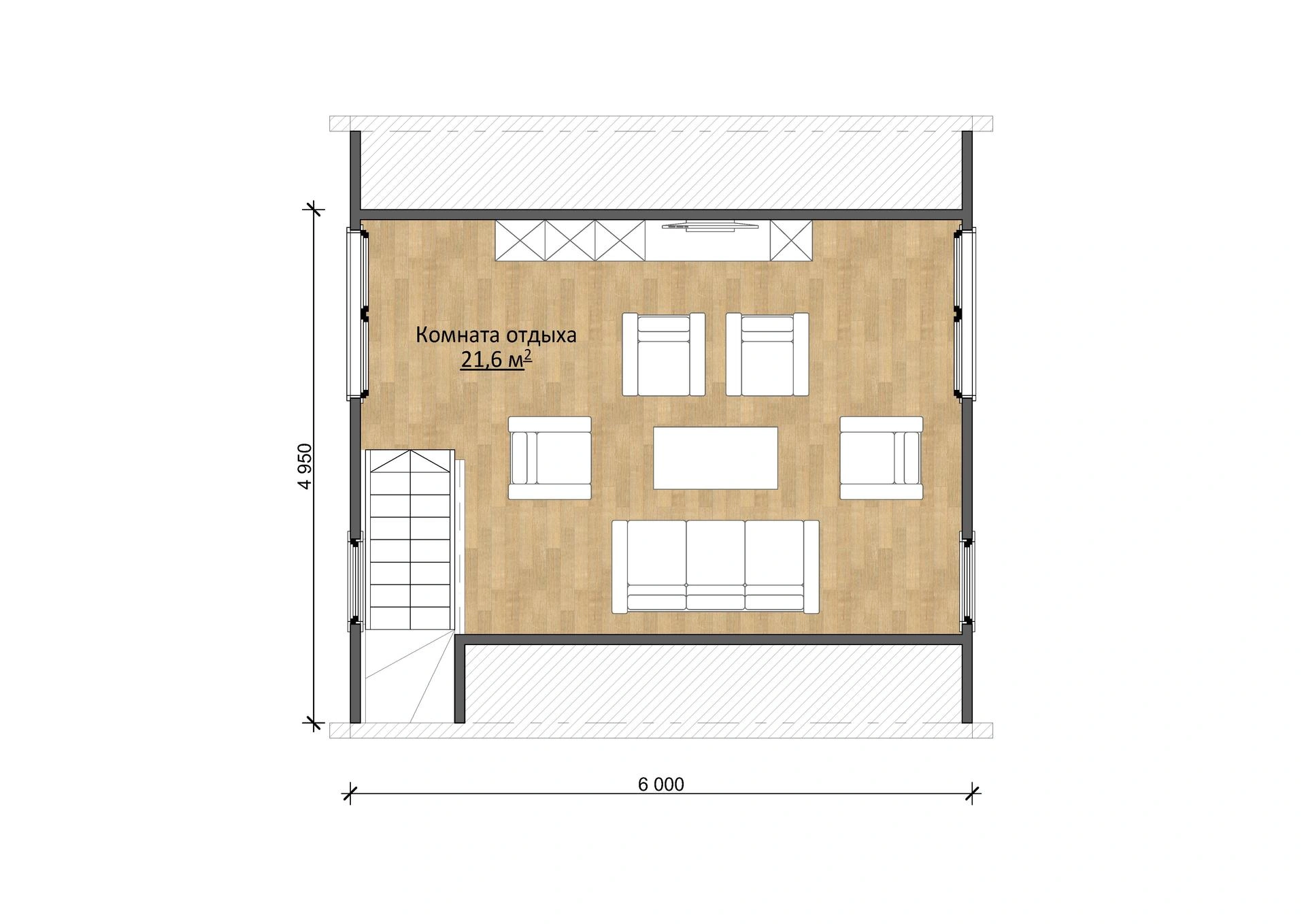 На втором этаже представлена мансарда, из которой можно сделать одну большую комнату отдыха или гостиную. Площадь помещения составляет 21,6 м2.
