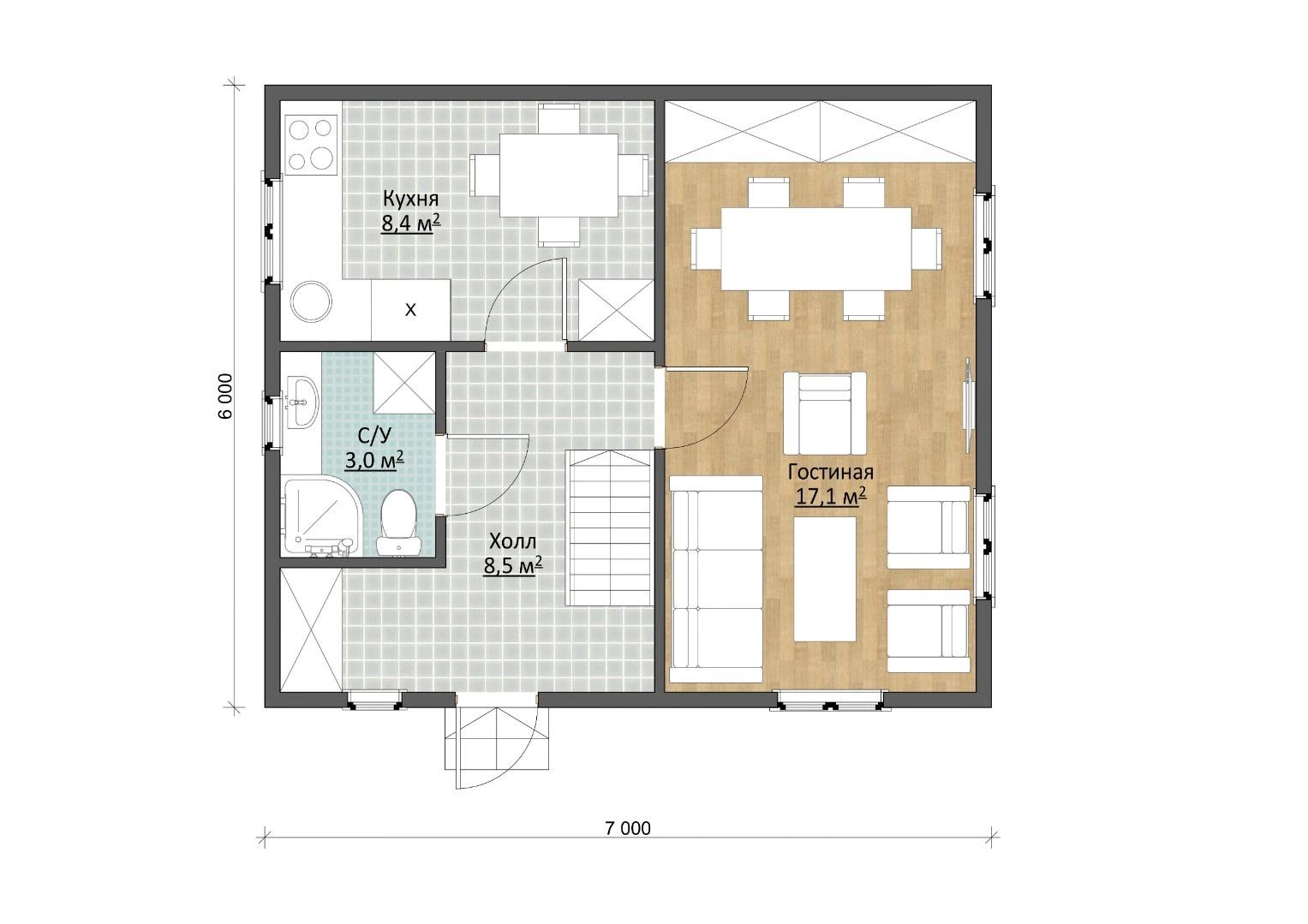 Кухня площадью 8,4 м² вмещает необходимую бытовую технику и позволяет организовать компактную обеденную зону. В примыкающей гостиной площадью 17,1 м² удобно отдыхать всем вместе, отмечать семейные праздники и устраивать посиделки с друзьями. Компактный 3-метровый санузел, располагающийся на нижнем этаже, можно оборудовать душевой кабиной и поставить стиральную машину.