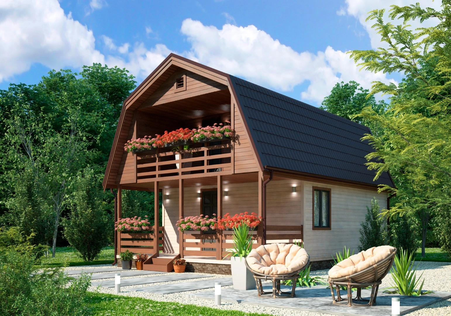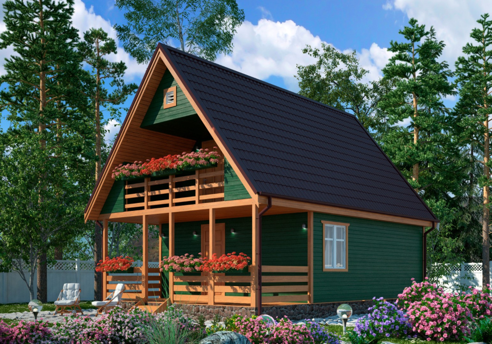 Практичный дачный дом с просторной мансардой и террасой. Отлично подойдёт для продолжительного отдыха на живописном берегу водоёма или вблизи лесного массива. Срок возведения всего — от 5 дней. Общая площадь — 73,09 м².