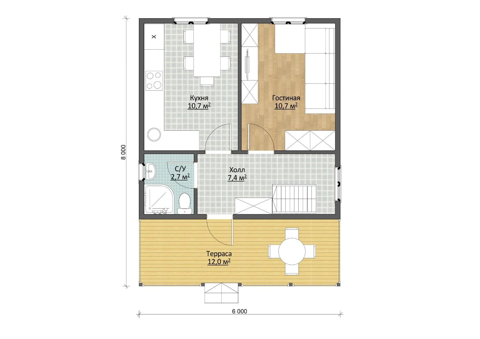 На первом этаже дома располагаются вместительный холл, с выходом на примыкающую 12-метровую террасу. Из прихожей можно пройти в 10,7-метровую кухню, а также — в гостиную. При желании эти помещения можно объединить в одно, устроив комфортабельную обеденную зону для всей семьи.