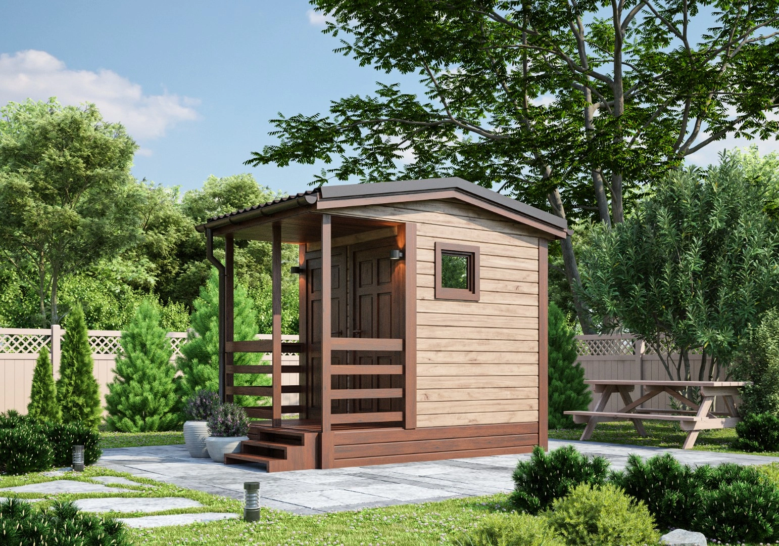 Предлагаем к заказу небольшую Душевую 3х2 м с компактной планировкой: отдельная моечная и туалет по 1,7 м², а перед входом — терраса 2 м².