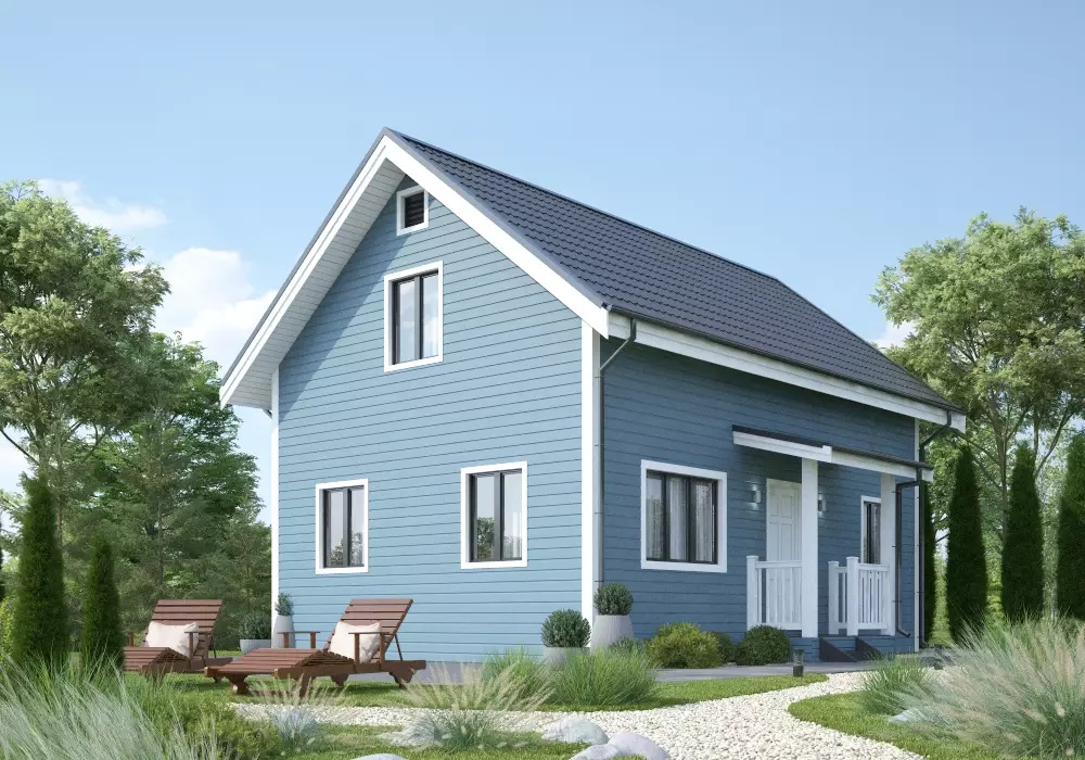 Двускатная кровля дома выглядит легкой и воздушной. Планировок целых пять, и они предусматривают наличие просторной кухни, гостиной, санузла и нескольких спален. Мансардная кровля позволяет сделать на втором этаже 3 полноценных помещения — спальню, детскую или кабинет. Выбирайте одну из двух комплектаций — Стандарт или Люкс. Они отличаюся фундаментом, толщиной утеплителя и окнами.