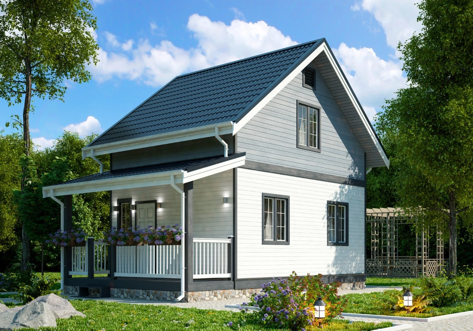 Двускатная кровля дома выглядит легкой и воздушной. Планировки две, и они предусматривают наличие просторной кухни, санузла, спальни и гостиной. Мансардная кровля позволяет сделать на втором этаже полноценную комнату, куда можно поставить и кровать, и высокий шкаф. Выбирайте одну из двух комплектаций — Стандарт или Люкс. Они отличаюся фундаментом, толщиной утеплителя и окнами.