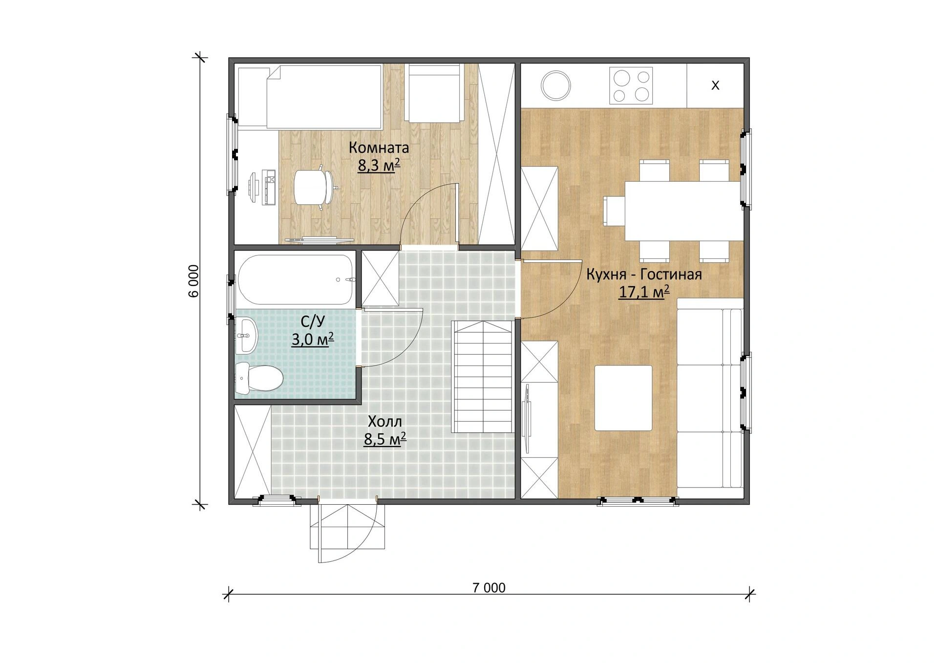 Первое, что бросается в глаза при входе, это просторный холл площадью 9 м2, в котором поместится шкаф для хранения верхней одежды и обувница. Из холла попадаем в кухню-гостиную (17,5 м2) — уютнейшее место для семейных посиделок. Рядом расположилась спальня или детская, выбор назначения комнаты зависит от потребностей заказчика.