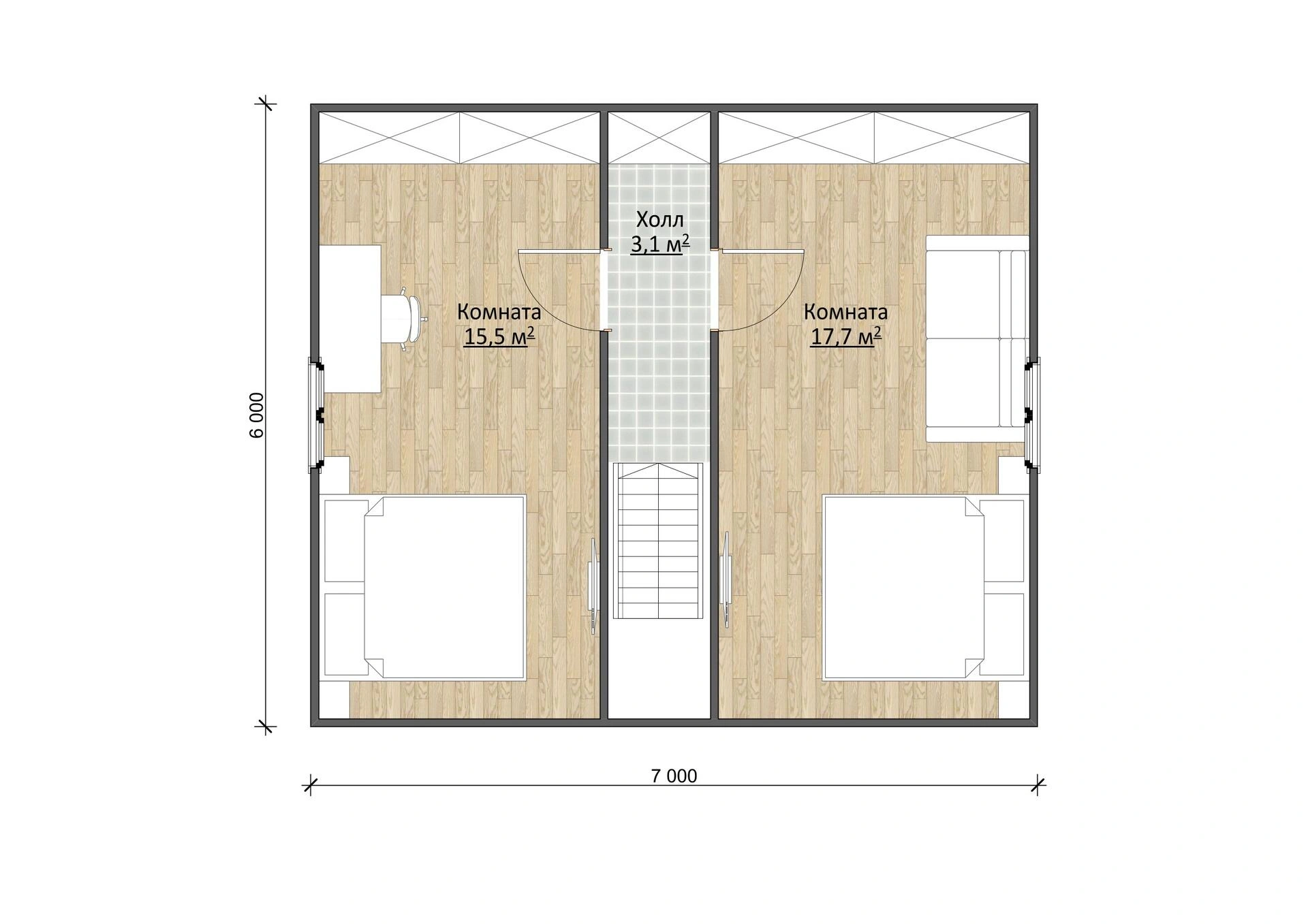 На втором этаже еще две свободных комнаты (15,9 м2 и 17,5 м2), которые могут быть спальней, кабинетом или зоной отдыха. Санузел (3,3 м2) один и находится на первом этаже. В нем поместится вся необходимая для жизни техника и мебель.