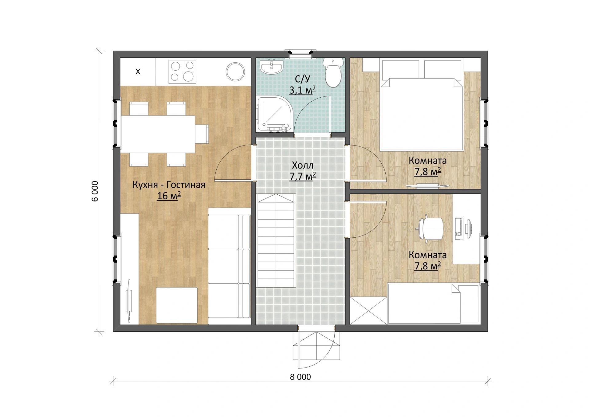 Две компактные комнаты по 7,8 м² подойдут для спальни и кабинета. При желании перегородку между ними можно убрать, объединив помещения в одно. Масштаб кухни-гостиной позволяет выделить зону для приготовления еды, обедов и отдыха. Площади 16 м² для этого достаточно.