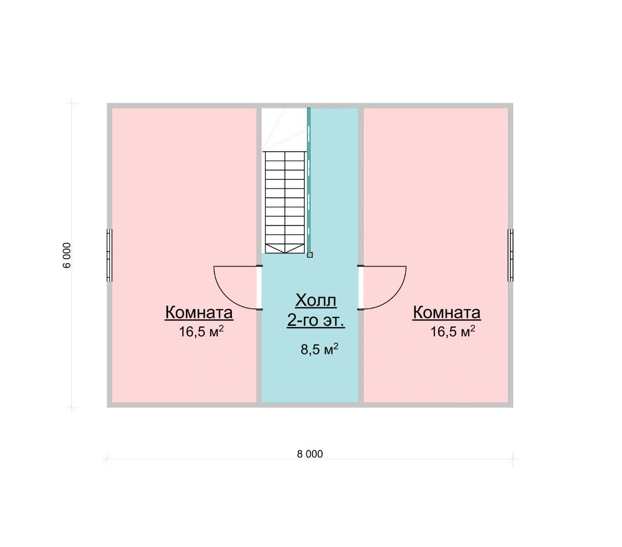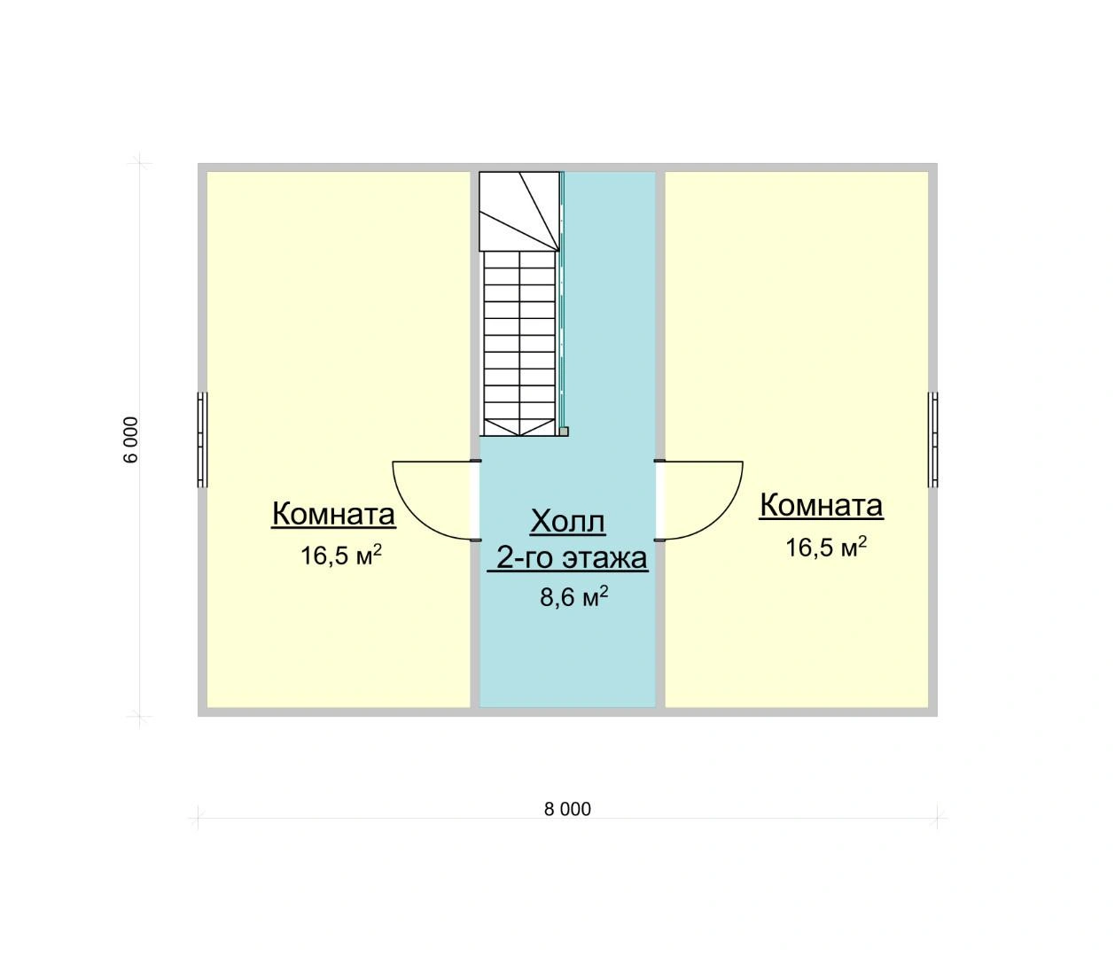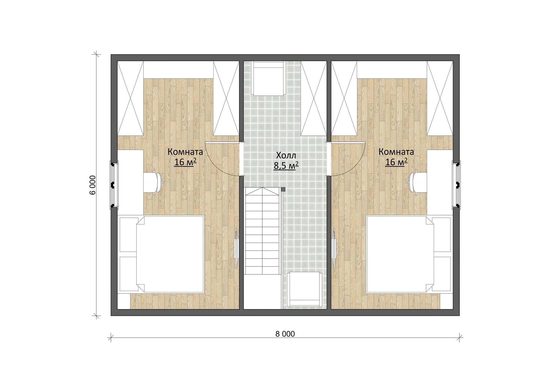 Наверху располагаются две изолированные 16-метровые комнаты, которые можно превратить в гостевую и детскую. В холл второго этажа отлично впишется гардеробная. При обсуждении проекта есть возможность дополнить проект инженерными коммуникациями, оборудовать дом системой отопления, выбрать утепление, покраску, отделку стен, а также пристроить террасу или веранду.