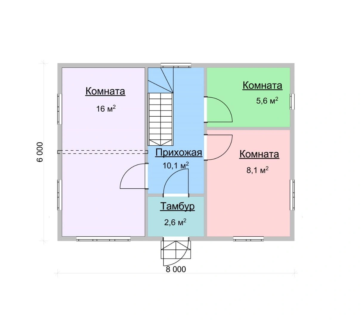 На первом этаже дома расположен холл площадью 7,7 м², куда свободно помещаются шкафы и стеллажи для хранения одежды и прочих необходимых вещей. Функциональный санузел площадью 3,1 м², куда можно установить унитаз, раковину и душевую кабину.