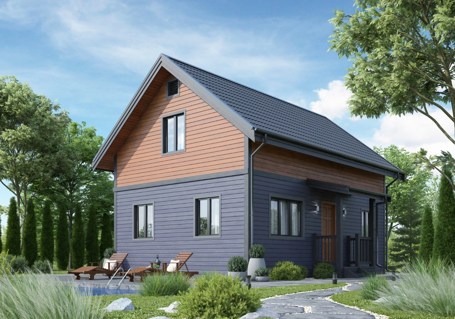 Комфортабельный загородный дом в полтора этажа, общей площадью 95.3 м², с прекрасной планировкой: четыре спальни, терраса, два санузла и просторная кухня-гостиная. Вариантов комплектации в проекте несколько и в любой можно внести изменения. Срок возведения под ключ — от 15 дней.