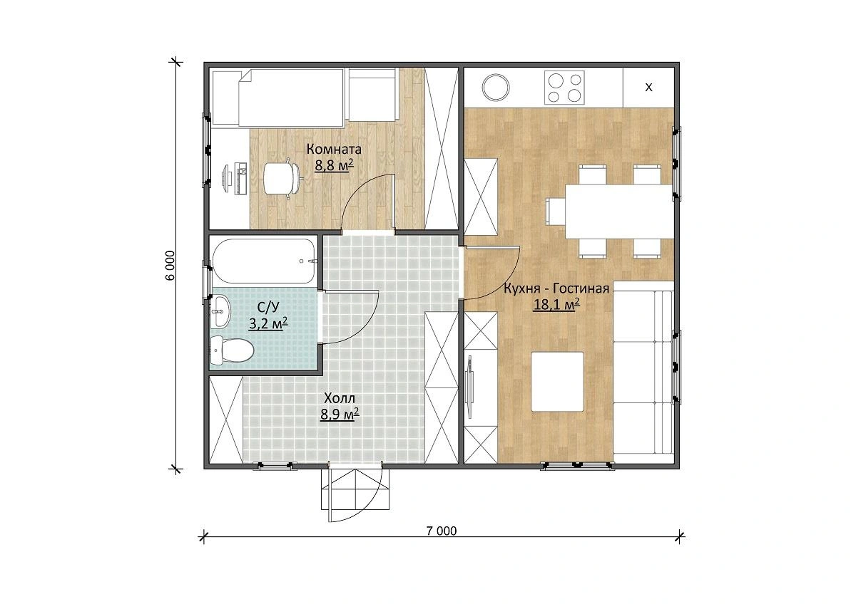 Внутренняя планировка садового дома очень удачная для небольшой семьи. Здесь четко разделены функциональные зоны. Для дневного времяпрепровождения предусмотрена просторная кухня-гостиная площадью 18,1 м2. Открытая планировка и множество окон делают это помещение светлым и просторным. Для сна запроектирована отдельная спальня 8,8 м2. Также экспликация включает санузел 3,2 м2 и Г-образный холл 8,9 м2, выполняющий функции прихожей и гардероба.