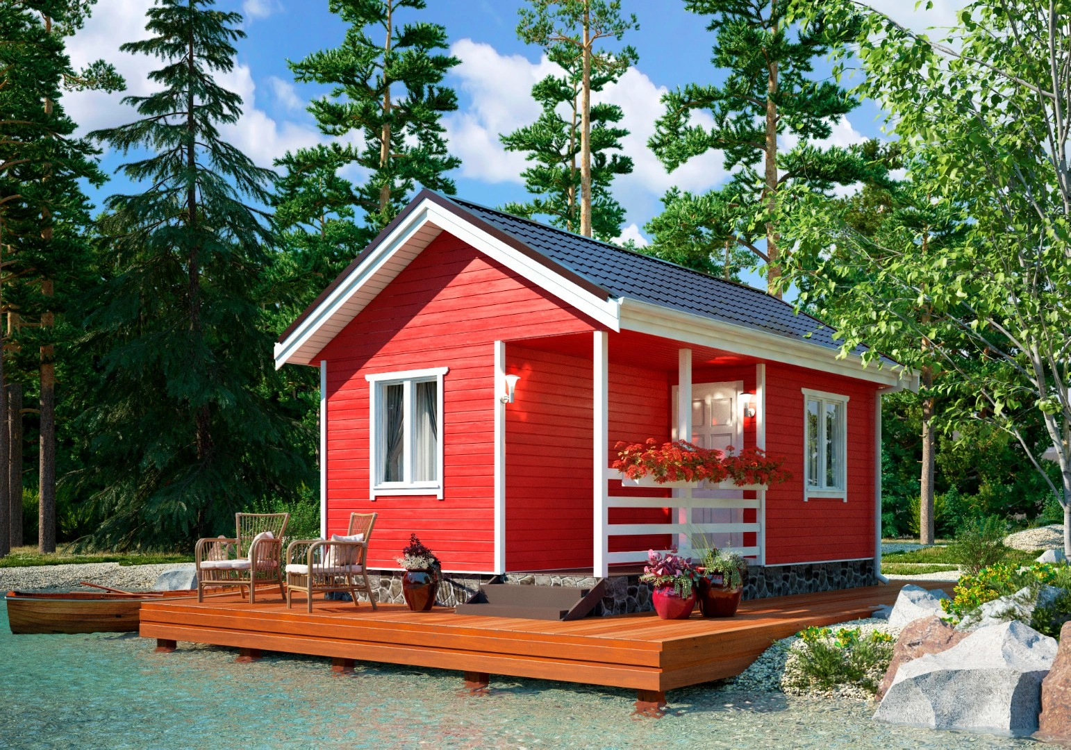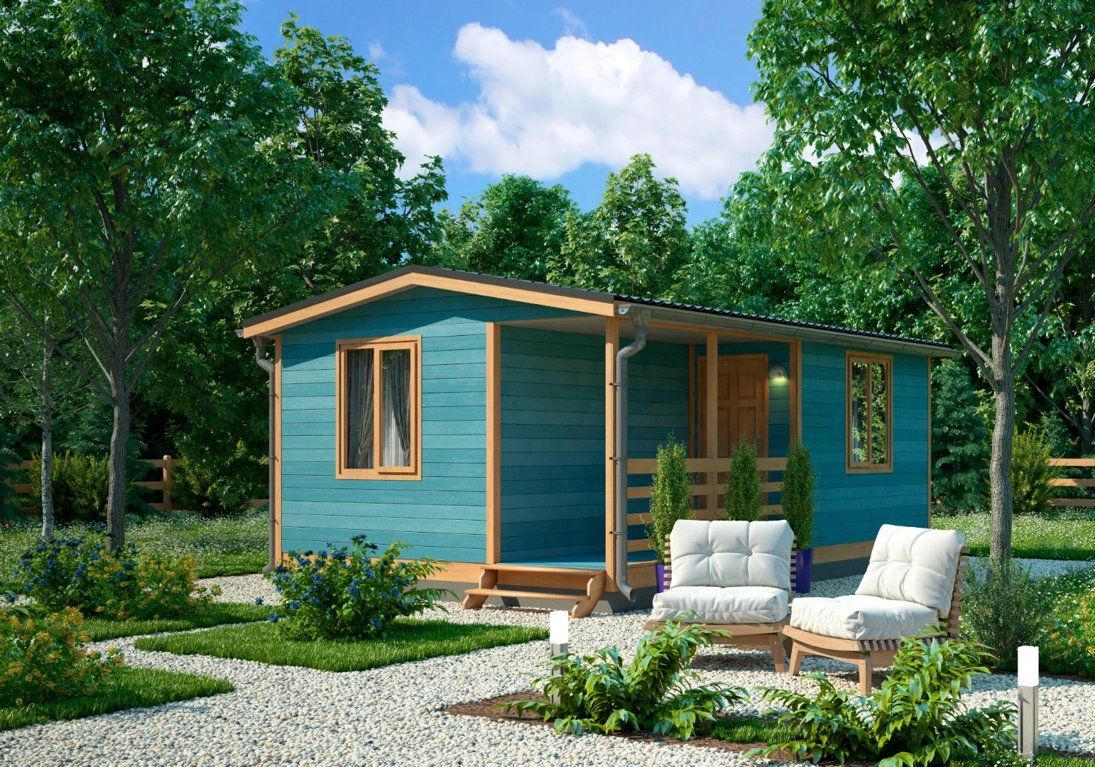 Одноэтажный садовый дом предназначен для временного проживания. Благодаря практичной прямоугольной форме и небольшим размерам (6х4 м) его будет несложно разместить на загородном участке.