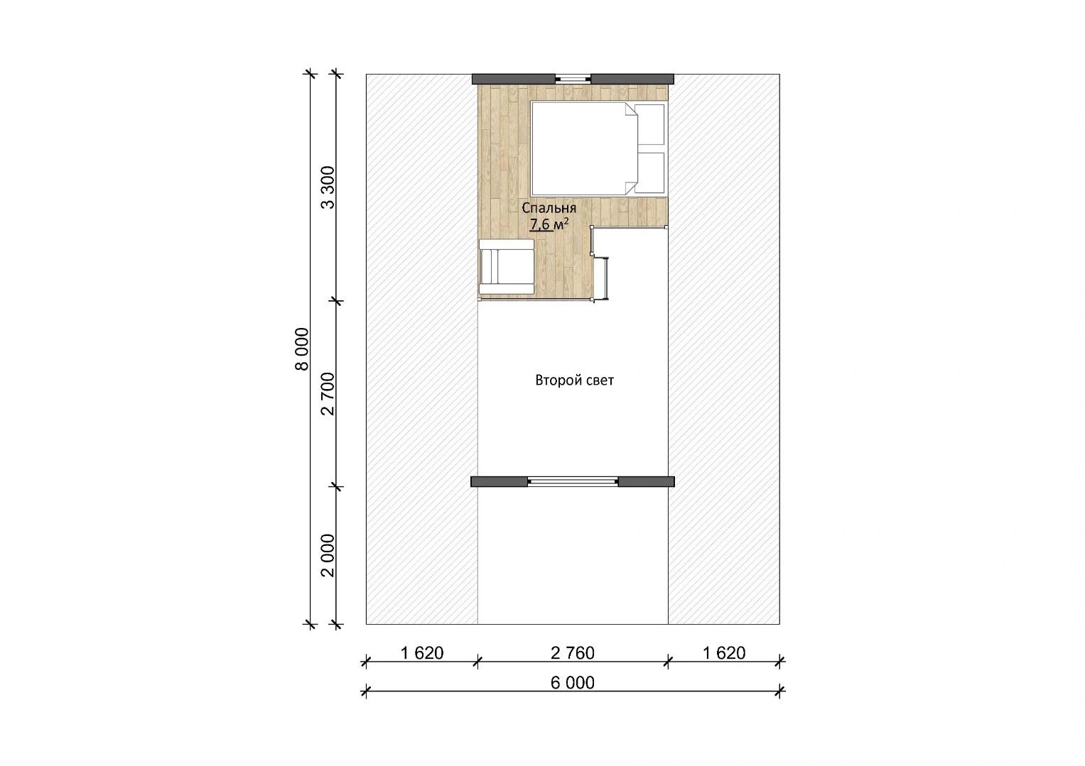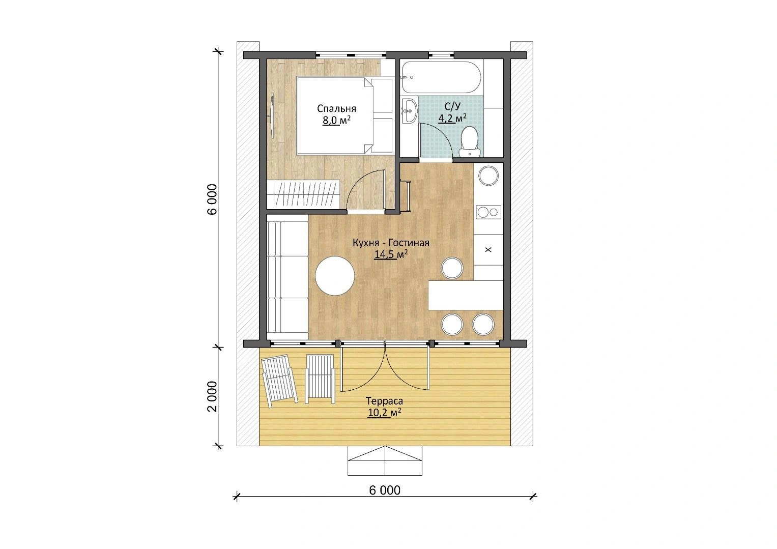 На первом этаже расположены большая гостиная-кухня, спальня и санузел. Есть место под просторную террасу. Мансардный этаж вмещает еще одно помещение, в котором можно поставить кровать или организовать рабочий кабинет.