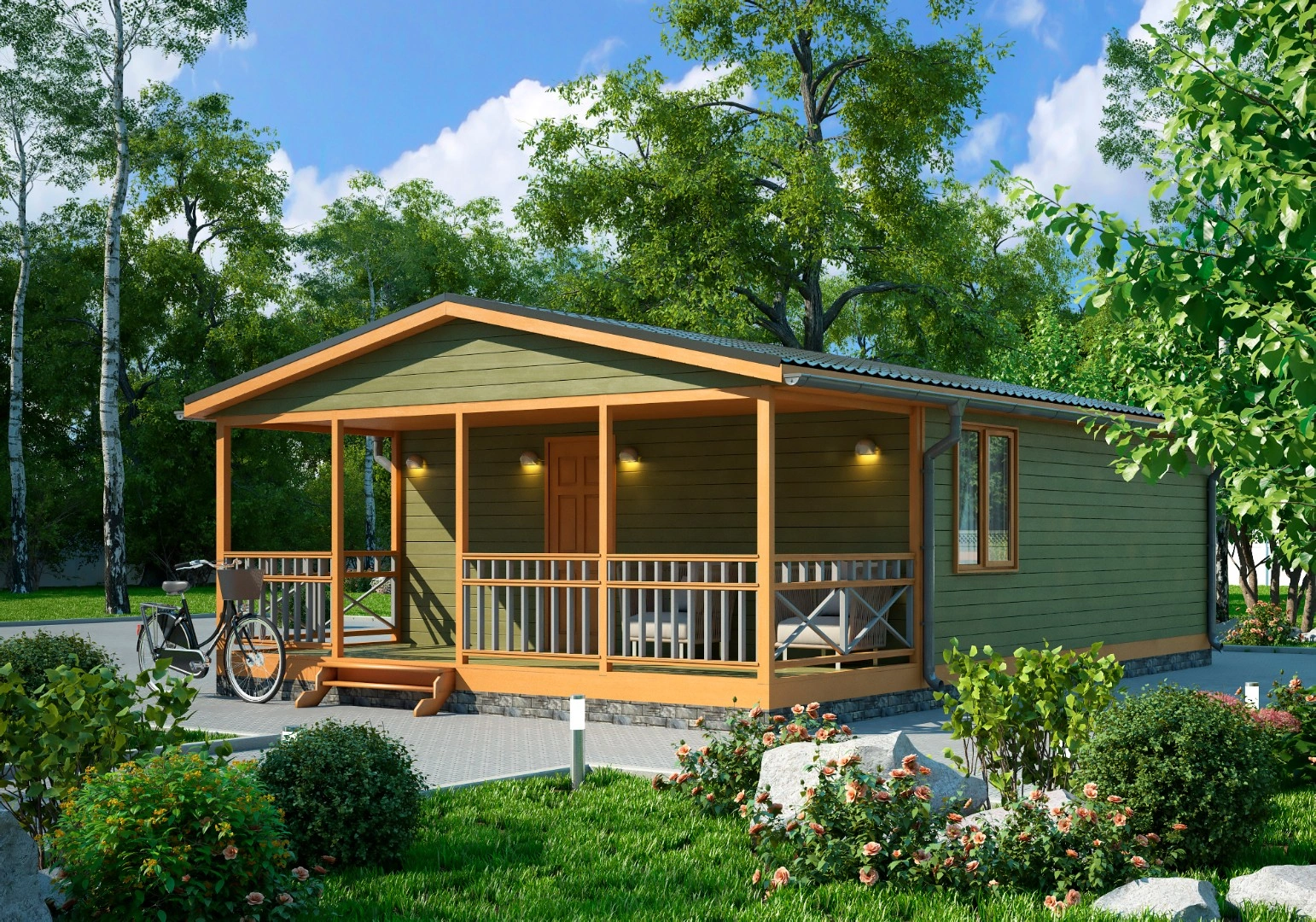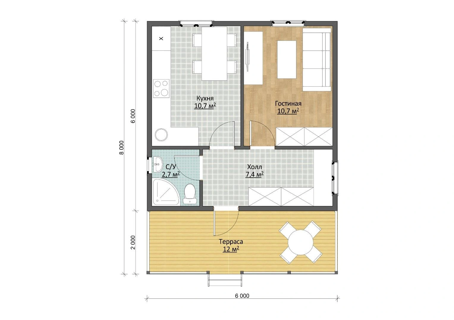 В садовом доме 6х8 м вы найдете все для комфортного отдыха в любое время года. На входе запроектирована длинная, просторная терраса – площадка 12 м2 защищена от непогоды фронтальным выносом двускатной крыши и обрамлена по периметру ограждением. На ней можно проводить летний досуг, обедать или ужинать всей семьей.