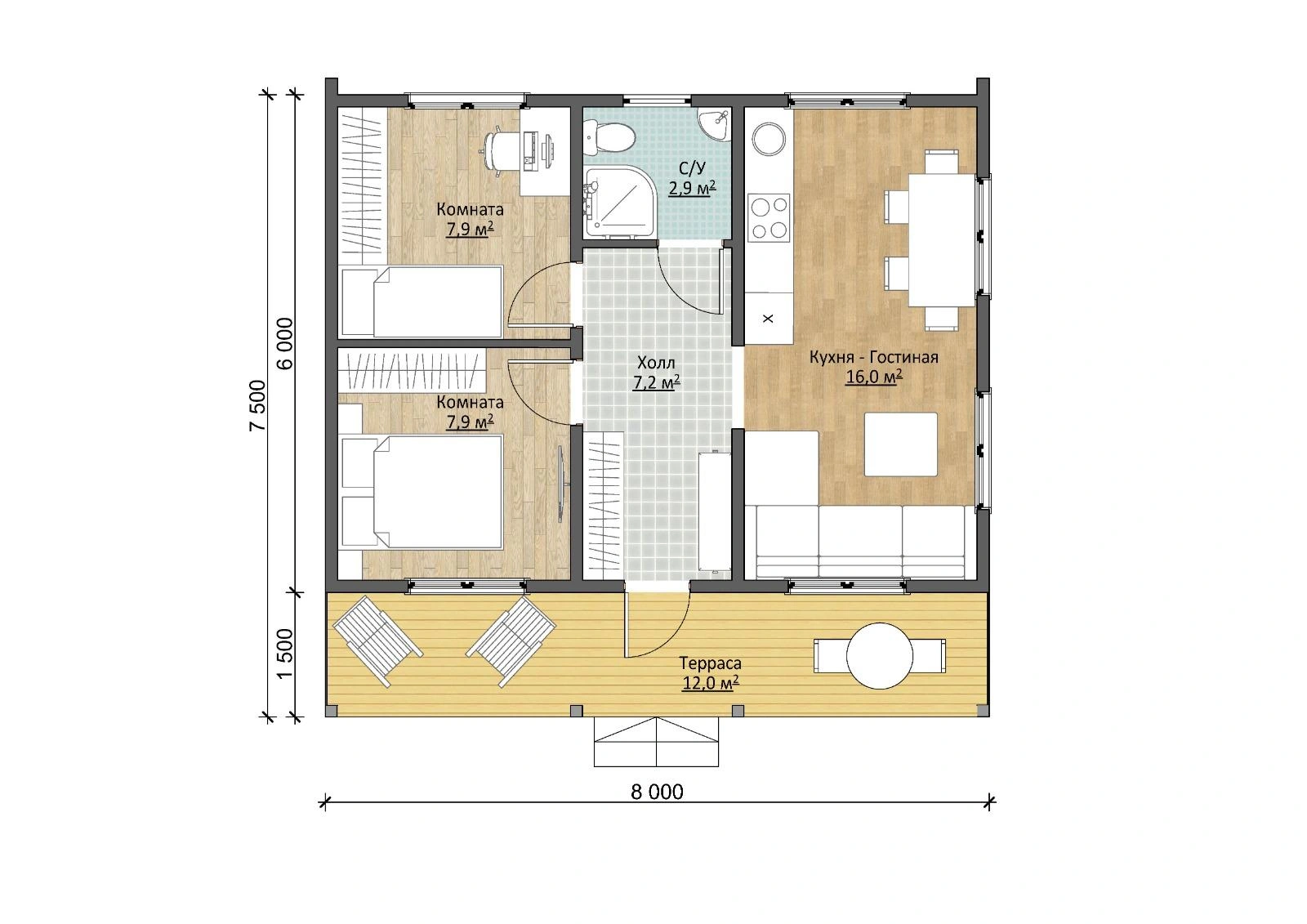Внутренняя планировка включает большую кухню-гостиную площадью 16 м², две уютные спальни, просторный коридор и компактный санузел. Снаружи находится просторная терраса, на которой хорошо разместить стол и кресла для отдыха на свежем воздухе. При необходимости перегородки можно перенести, изменить комплектацию дома, пристроить дополнительное крыльцо.