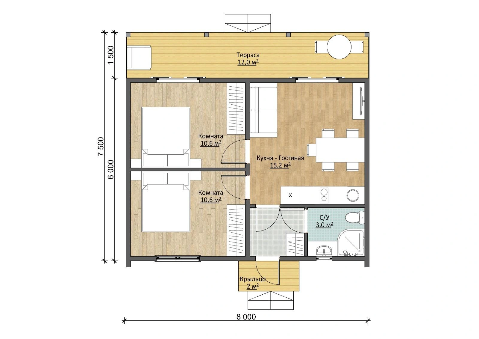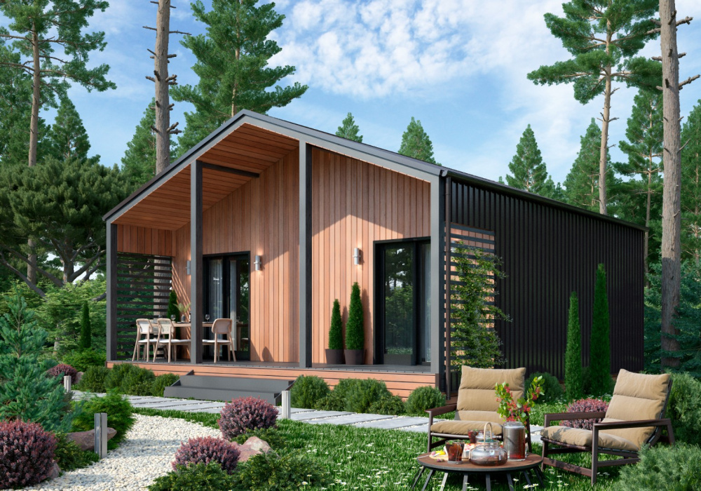 В доме предусмотрено несколько комнат: просторная гостиная, совмещенная с кухонной зоной, и две спальни. Есть компактная ванная и небольшой тамбур. Снаружи находится терраса, где можно организовать дополнительные места для отдыха.