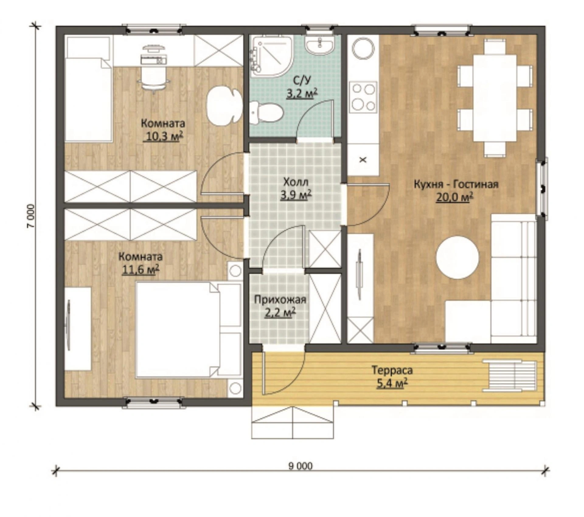 Планировка подразумевает кухню-гостиную площадью 20 м2. Эта зона является сердцем дома, где можно заниматься приготовлением кулинарных шедевров, принимать пищу и отдыхать. Далее идет комната площадью 10,3 м2, которую можно использовать как кабинет, игровую или даже комнату для гостей, в зависимости от потребностей и предпочтений заказчика. В доме есть уютная спальня площадью 11,6 м2, где можно отдохнуть и восстановить силы. В спальне достаточно места для кровати, прикроватных тумбочкек, шкафа и дополнительных решений для хранения. Ванная комната площадью 3,2 м2 может быть оснащена всеми необходимыми удобствами: душ или ванна, раковина и туалет. Места для хранения могут быть включены в пространство. К дому также пристроена терраса площадью 5,4 м2, на которой одно удовольствие отдыхать с семьей.