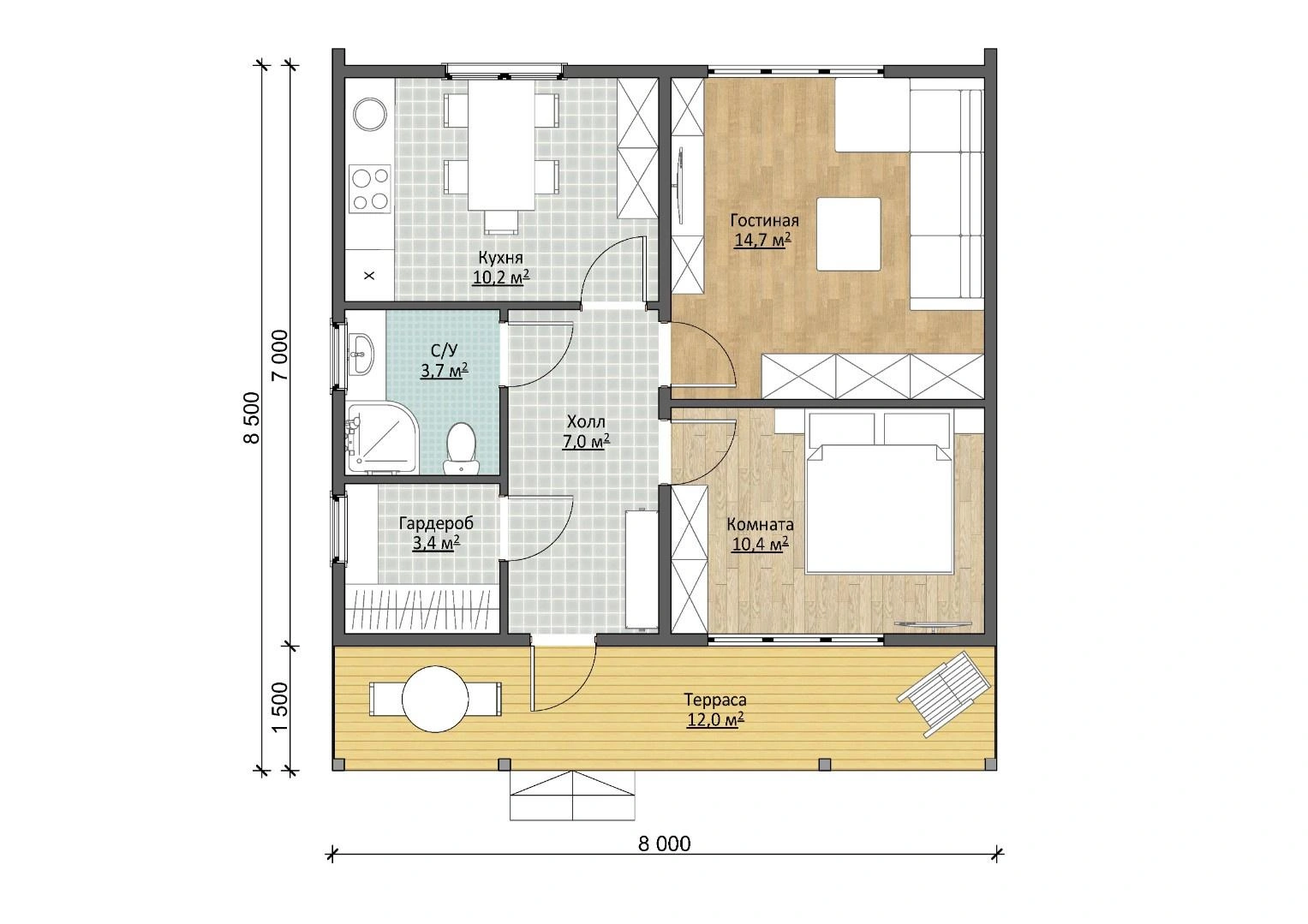 Планом предусмотрено несколько комнат: просторная гостиная (14,7 м2), кухня (10,2 м2), спальня (10,4 м2) и гардеробная (3,4 м2). Есть компактная ванная (3,7 м2) и функциональный холл (7 м2). Снаружи находится длинная терраса (12 м2), где можно организовать дополнительные места для отдыха.