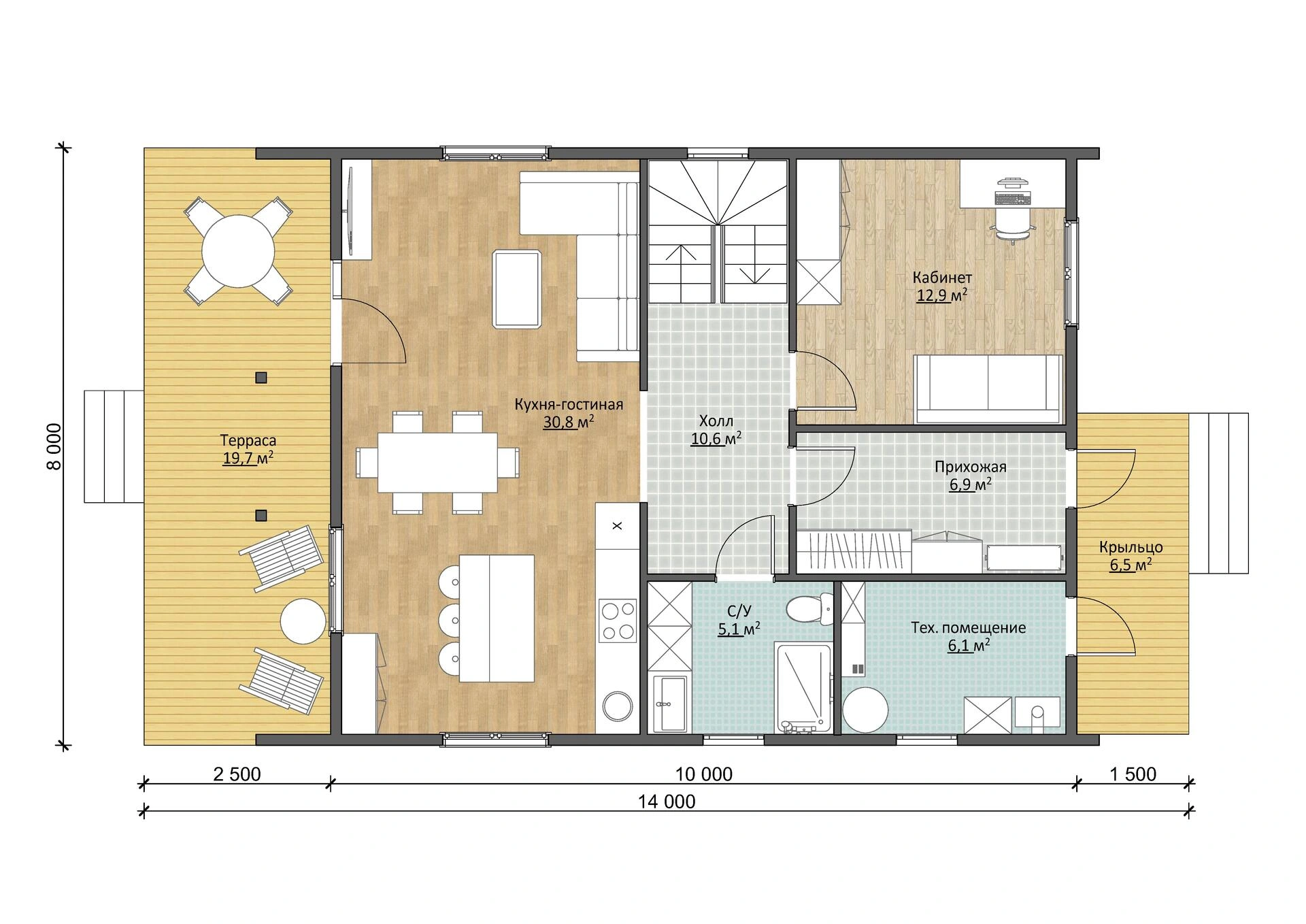 Также на первом этаже есть техническое помещение (6,1 м2), где установлено все необходимое оборудование, поддерживающее комфортную обстановку в доме. Войти в помещение можно с улицы.