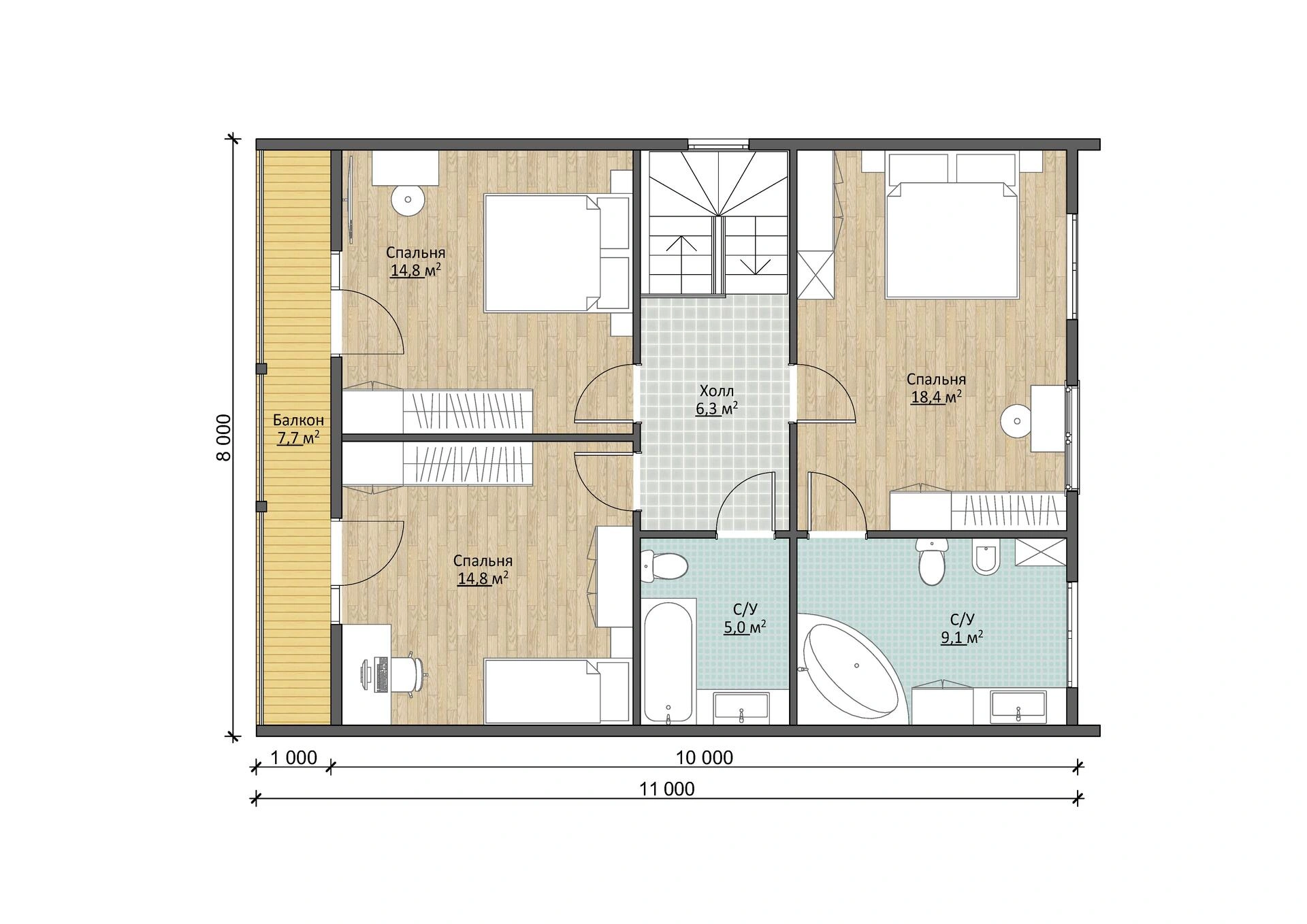 Далее проходим на второй этаж, где спроектированы 3 спальни (14,8 м2, 14,8 м2 и 18,4 м2), 2 санузла (5 м2 и 9,1 м2) и балкон (7,7 м2).