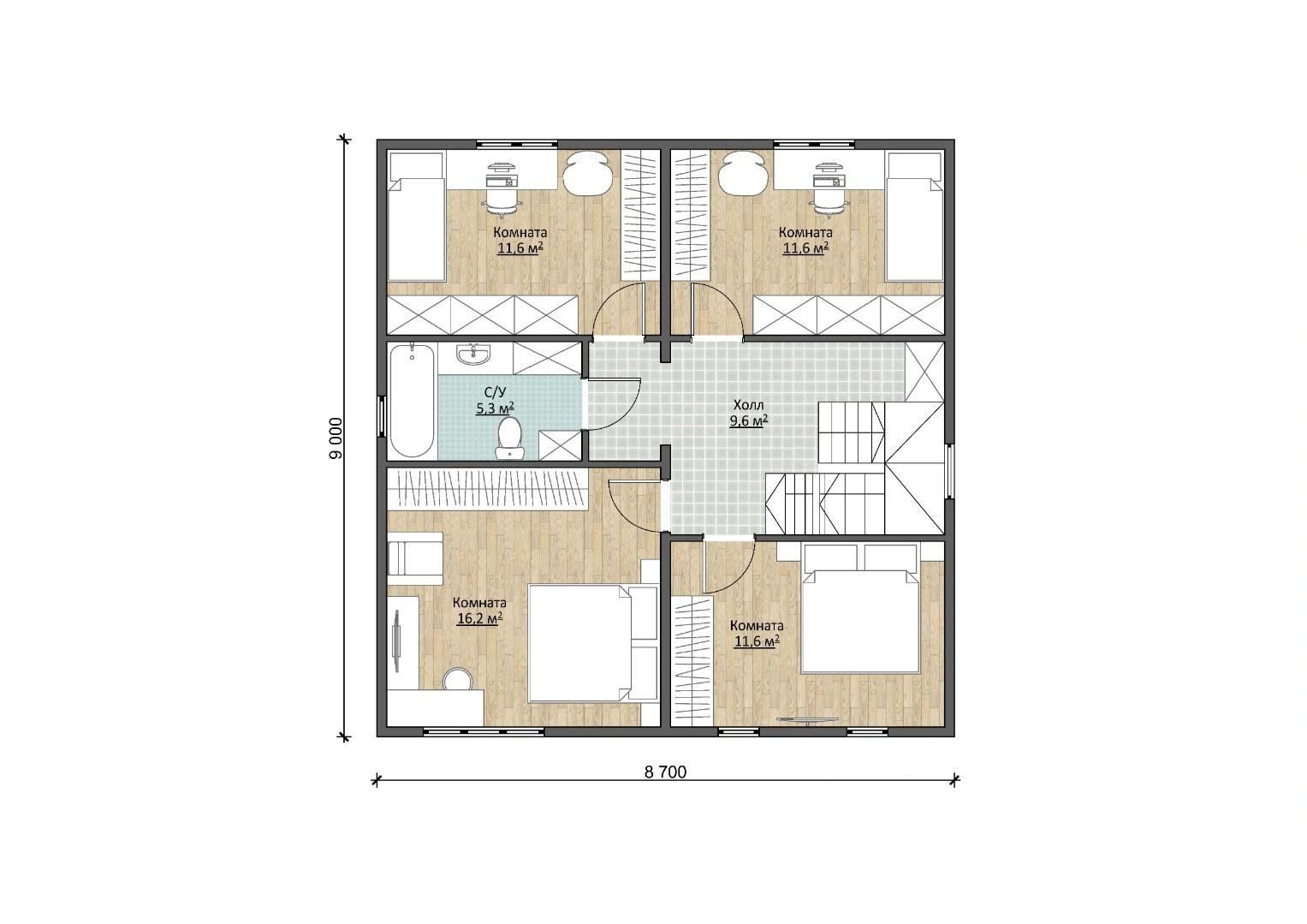 В гостиной 20,2 м2 идеально принимать гостей, а в 12,4-метровой комнате на первом этаже можно оборудовать кабинет или спальню. Санузел площадью в 4,7 м2 свободно вместит всю необходимую сантехнику. На втором этаже удобно организовать еще четыре спальни, или использовать некоторые комнаты под детские или зоны отдыха.