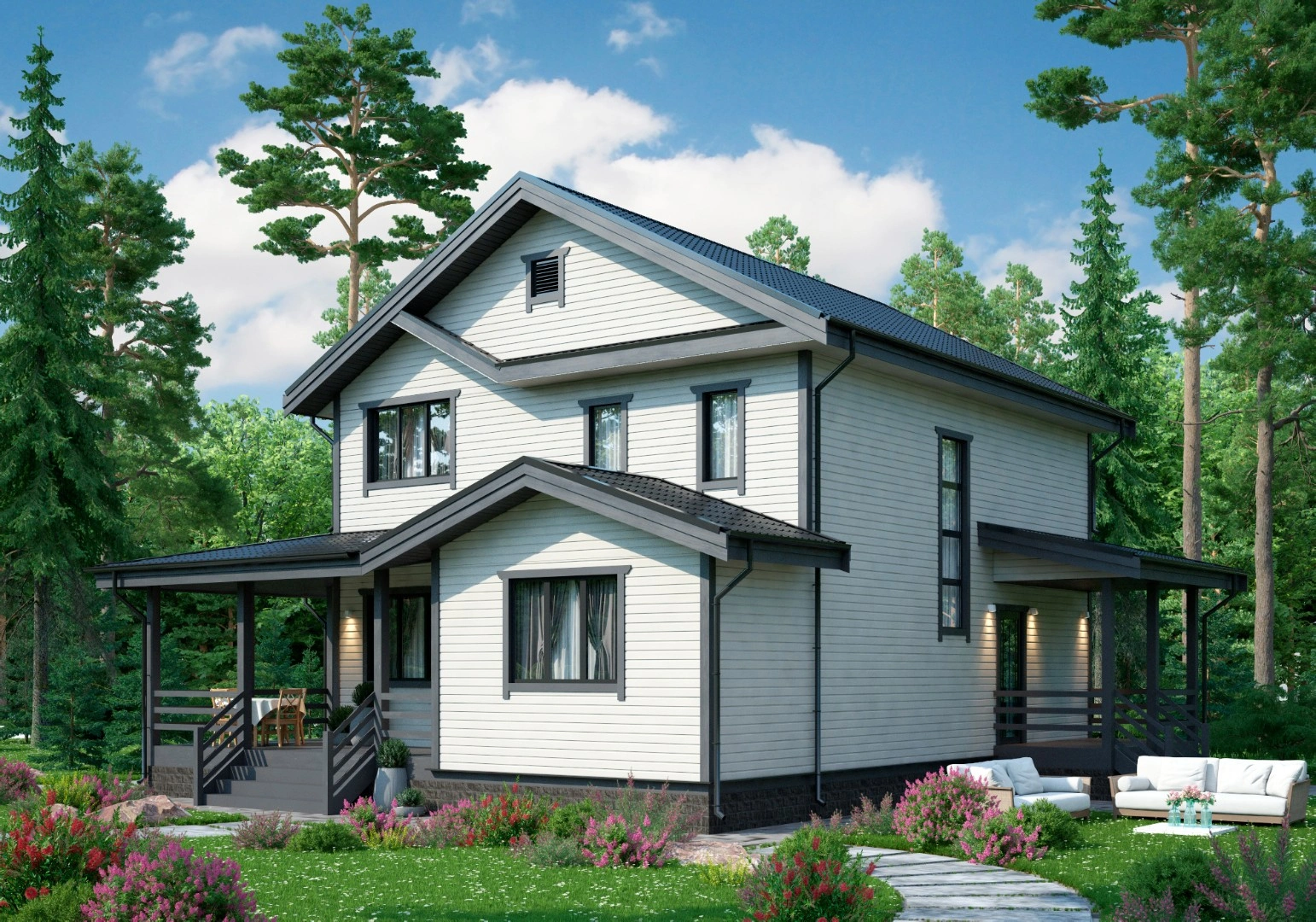 Коттедж Статус 8х11 Веда в 2 этажа с кухней, гостиной, пятью спальнями и двумя санузлами с общей площадью 166,09 м2. Прекрасное архитектурное решение для отдыха на даче всей семьей или постоянной жизни за городом.