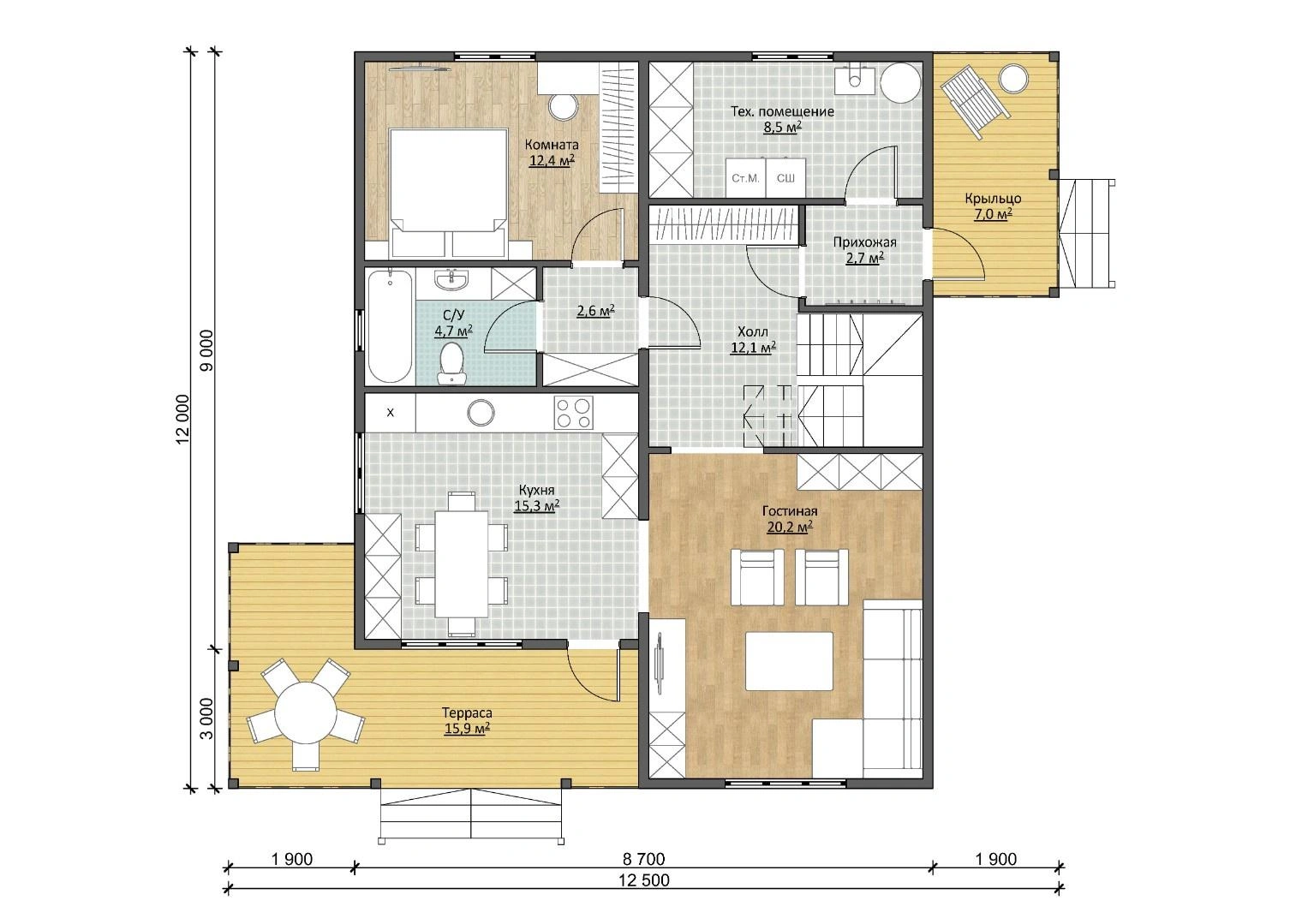 На улице также есть две зоны, где можно расслабиться: терраса (15,9 м2) и крыльцо (7 м2).