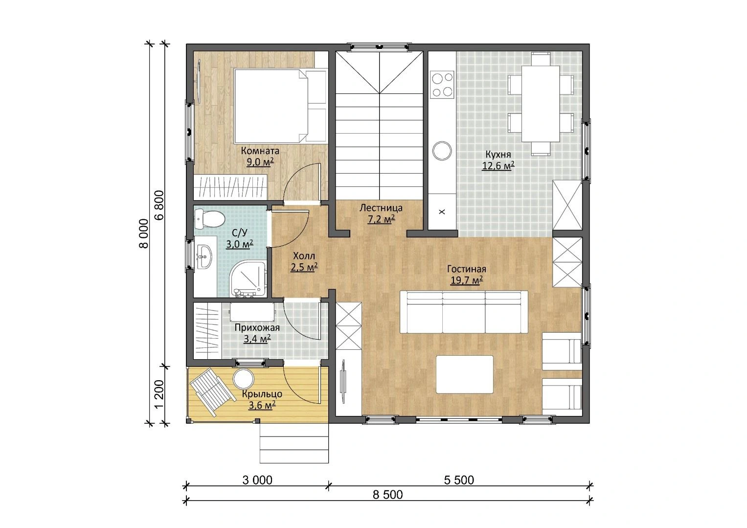 Крыльцо защищает вход от неприятных погодных условий. А его площадь 3,6 м2 позволяет разместить кресло и журнальный столик для приятного времяпрепровождения.