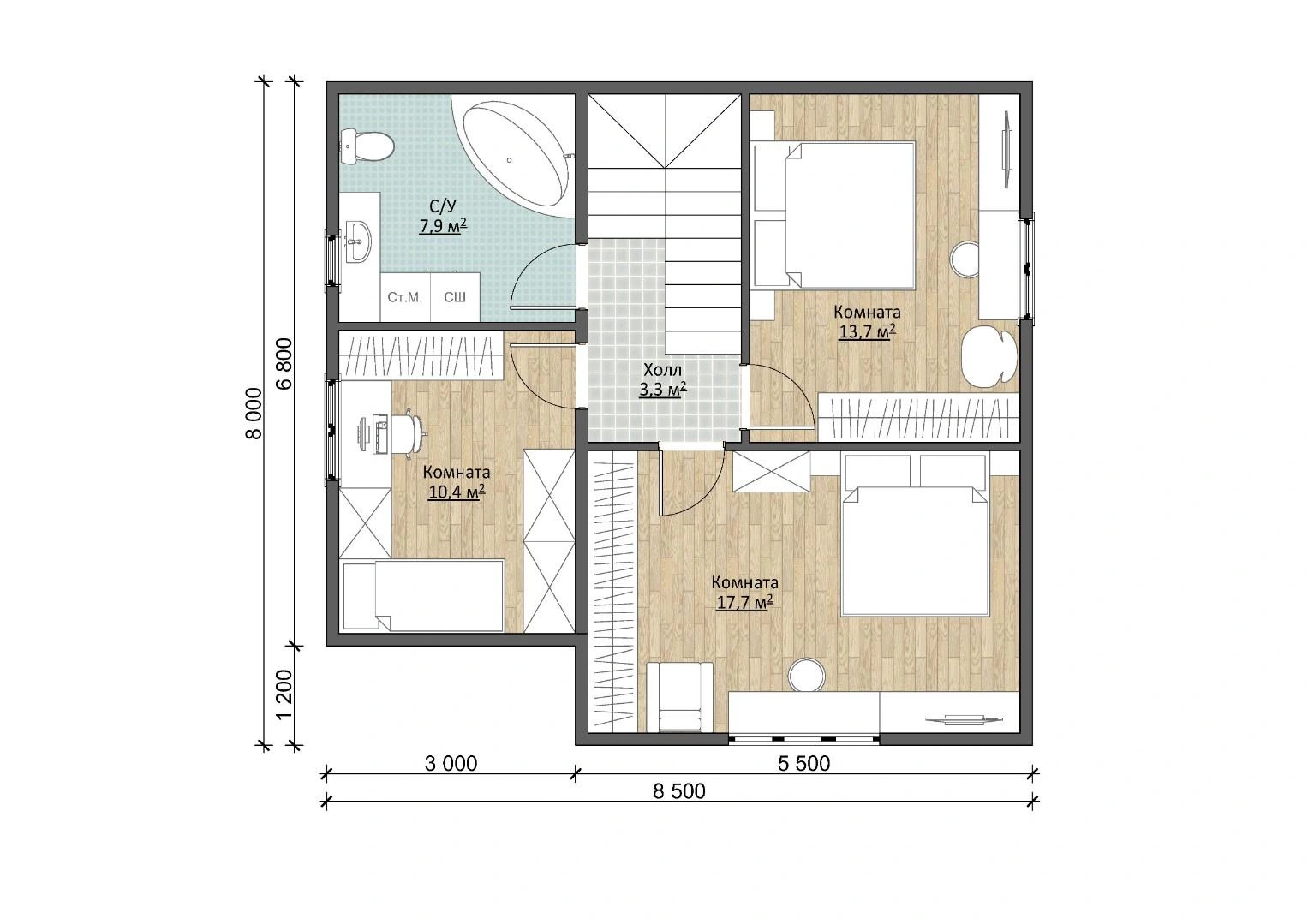 Например, кухню с гостиной объединяет межкомнатная арка, из-за чего создается ощущение глубины пространства. Здесь поместится вся необходимая мебель и техника. Два совмещенных санузла на первом и втором этаже удобно спланированы и размещены.