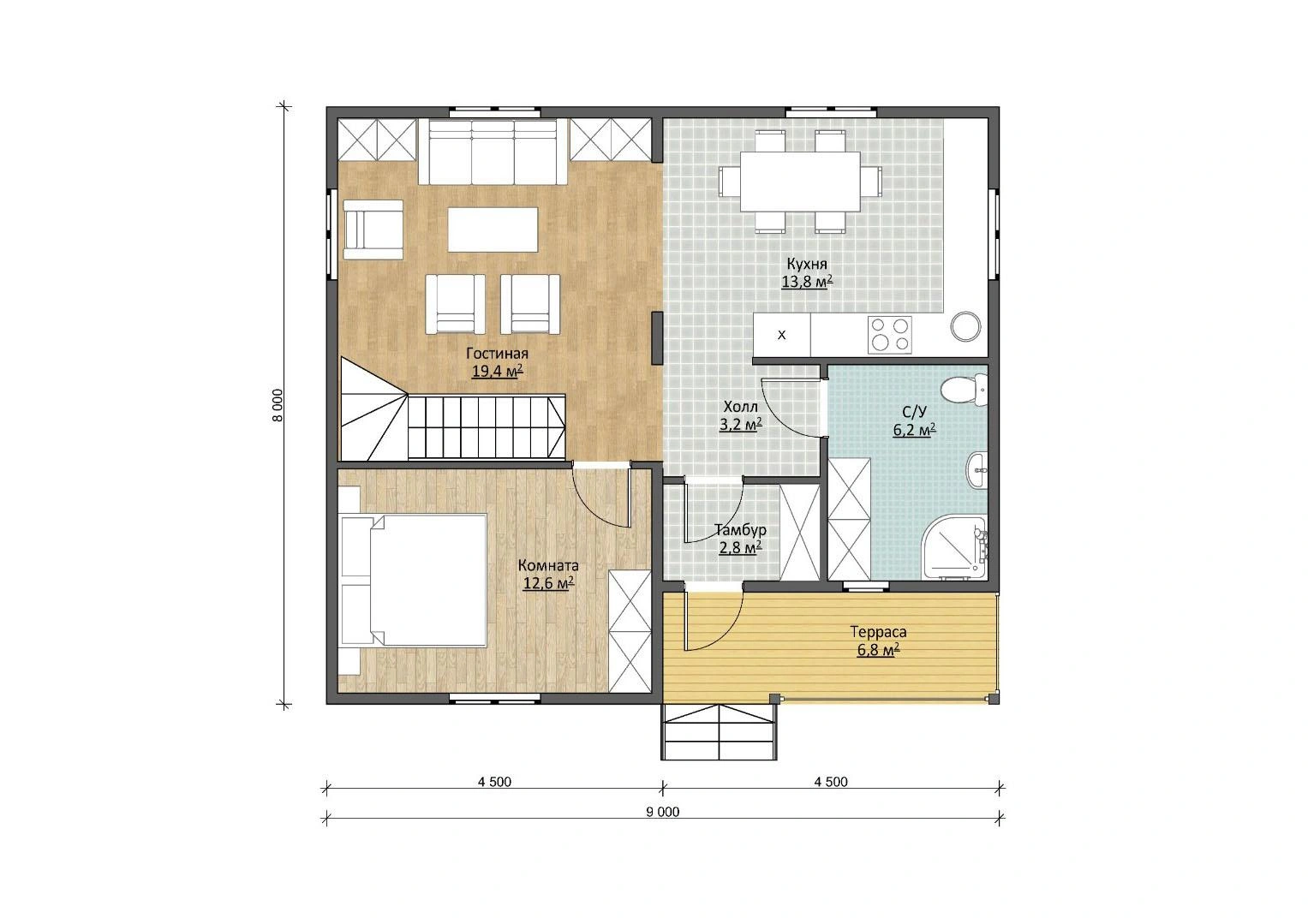 Начнем с террасы площадью 6,8 м2. На ней поместится все необходимое для дачного участка — от хозяйственных принадлежностей до гриля и садовой мебели. Терраса станет любимым местом отдыха всей семьи в теплые времена года.