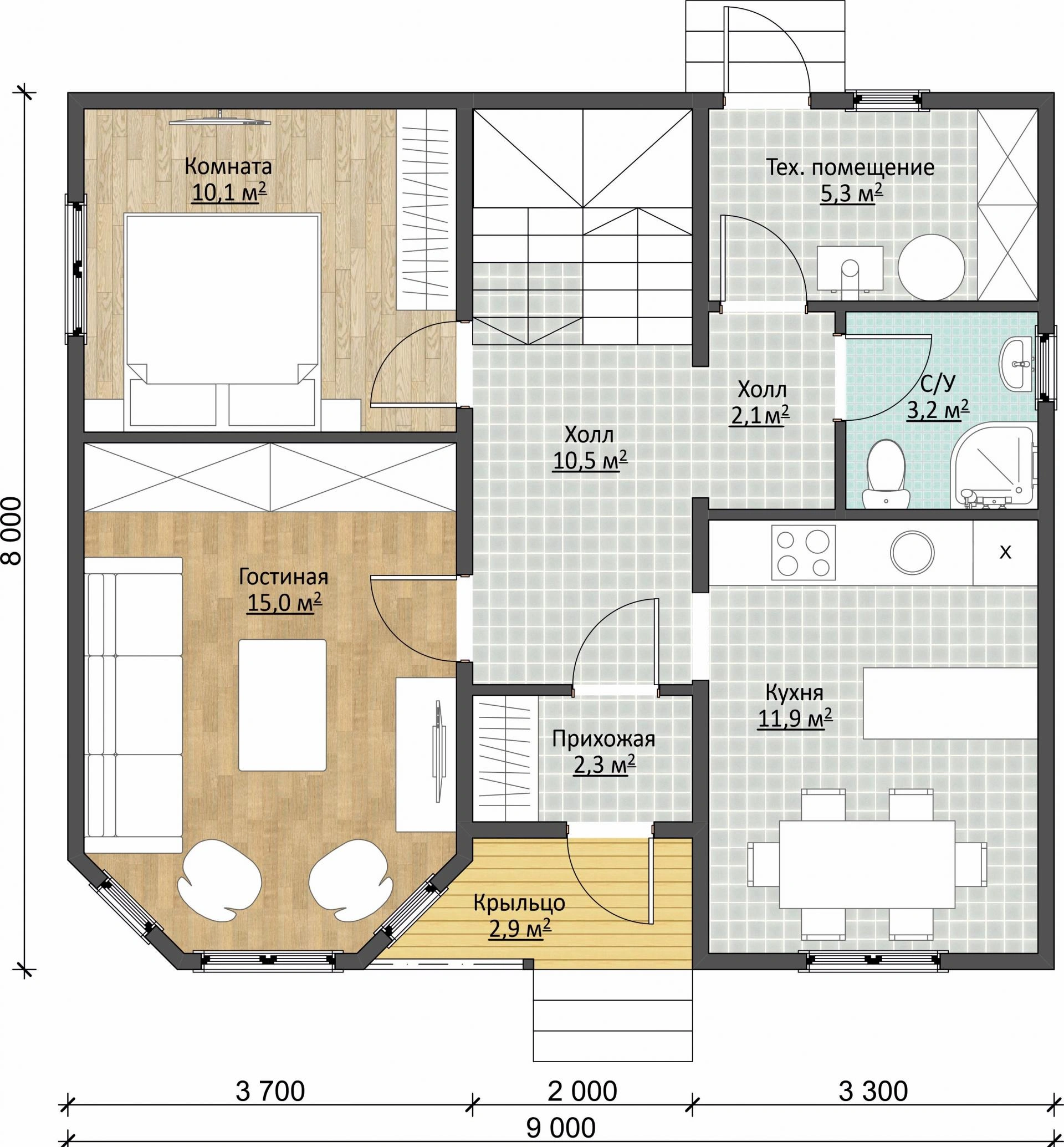 Заходя в дом, попадаем сразу в прихожую (2,3 м2), а из нее в просторный холл (10,5 м2). Прихожая удерживает холод с улицы, поэтому в доме очень тепло и уютно. Далее заходим на кухню (11,9 м2), где есть небольшая столовая. Напротив расположена гостиная (15 м2) — отличное место для отдыха со всей семьей. Рядом с гостиной находится комната (10,1 м2). Ее можно назначить спальней или любой другой комнатой. Напротив расположился небольшой санузел (3,2 м2), а рядом с ним техническое помещение (5,3 м2), откуда есть выход на задний двор.