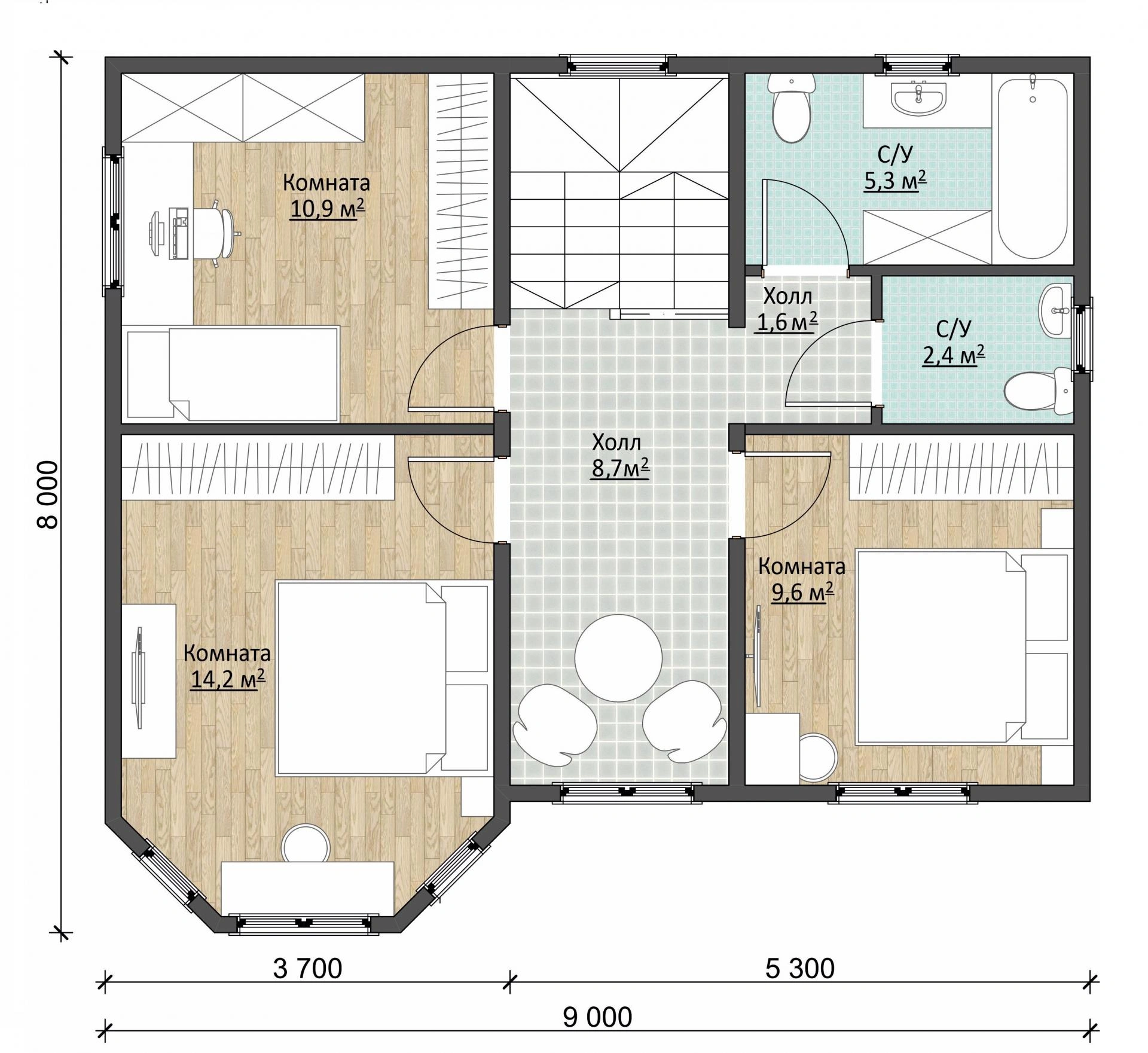 Поднимаемся на второй этаж и попадаем в не менее просторный холл (8,7 м2). Из него можно зайти в три комнаты площадью 9,6 м2, 10,9 м2 и 14,2 м2. Назначение комнат выбирает заказчик.