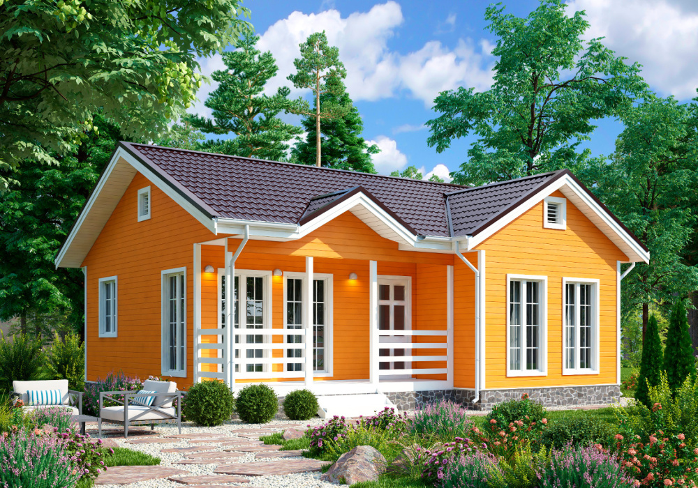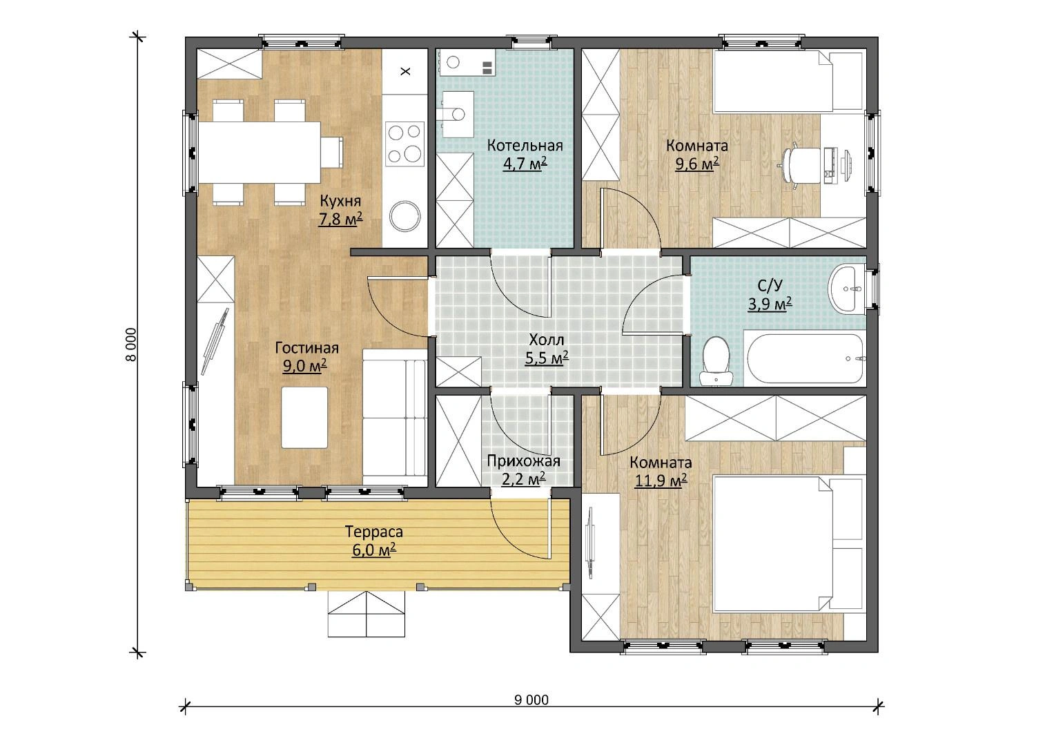Терраса площадью 6 м2 вмещает садовую мебель для отдыха и развлечений на природе. Прихожая (2,2 м2) отделяет холл (5,5 м2) от улицы и не дает холодному воздуху попасть в дом. Спальня (11,9 м2) послужит отличным местом для отдыха и восстановления сил. Сюда отлично впишется встроенный шкаф. Кухня (7,8 м2) совмещена с гостиной (9 м2), а это значит, что веселые встречи с друзьями и семьей будут проходить в комфортном и просторном помещении.